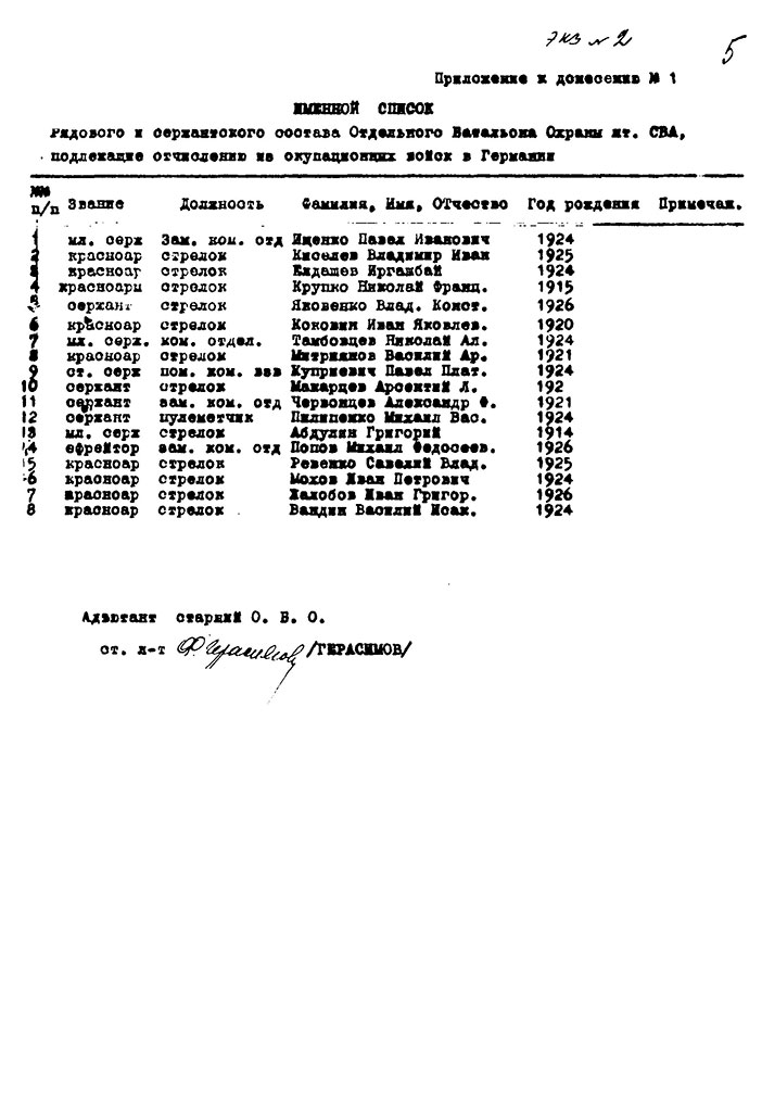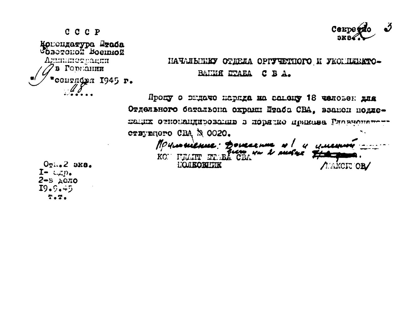 5 Ходатайство коменданта Штаба СВАГ С. С. Максимова начальнику Оргучетного отдела Штаба СВАГ о выдаче наряда на замену 18 человек для отдельного батальона охраны Штаба СВАГ. 19.09.45 г. Копия. Приложение: донесение, именной список рядового и сержантского состава отдельного батальона охраны. Копия. ГАРФ. Ф. 7317. Оп. 7. Д. 140-а. Л. 3-5.