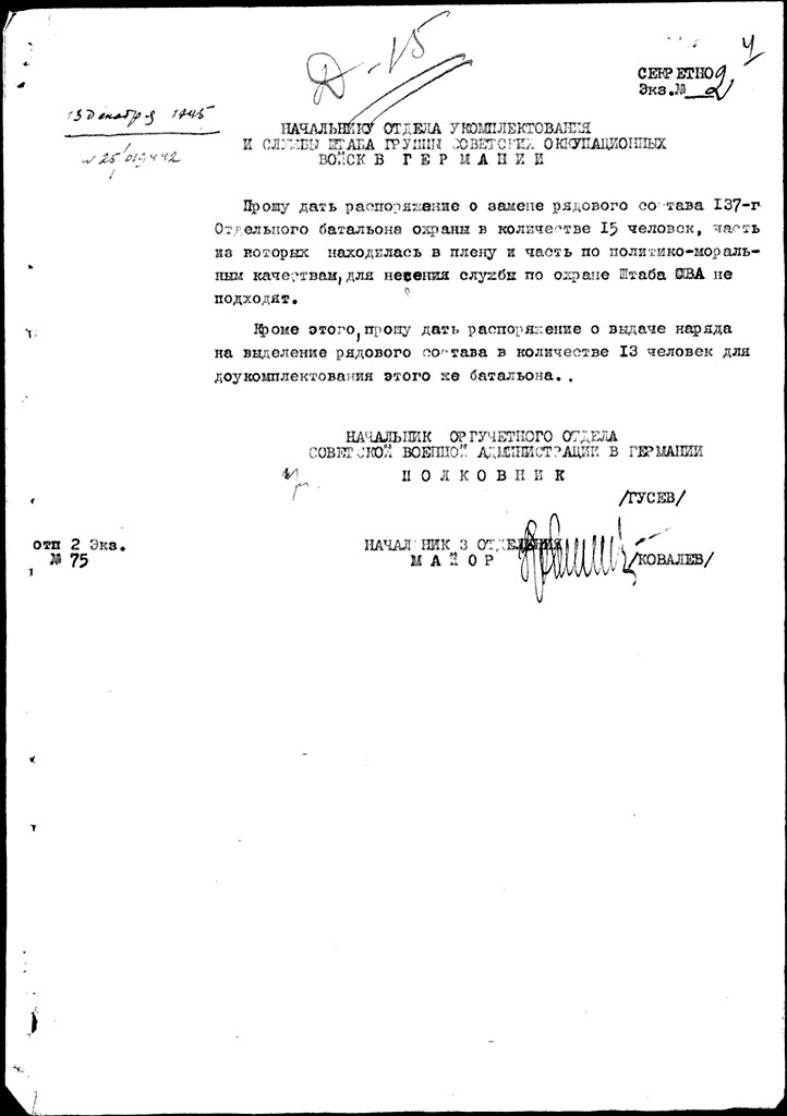 В качестве примера можно привести письмо начальника Оргучетного отдела СВАГ полковника В. К. Гусева и начальника 3 отделения майора Н. А. Ковалева начальнику отдела укомплектования и службы Штаба ГСОВГ от 13 декабря 1945 г. о замене рядового состава 137 обо и доукомплектовании до штатной численности.9