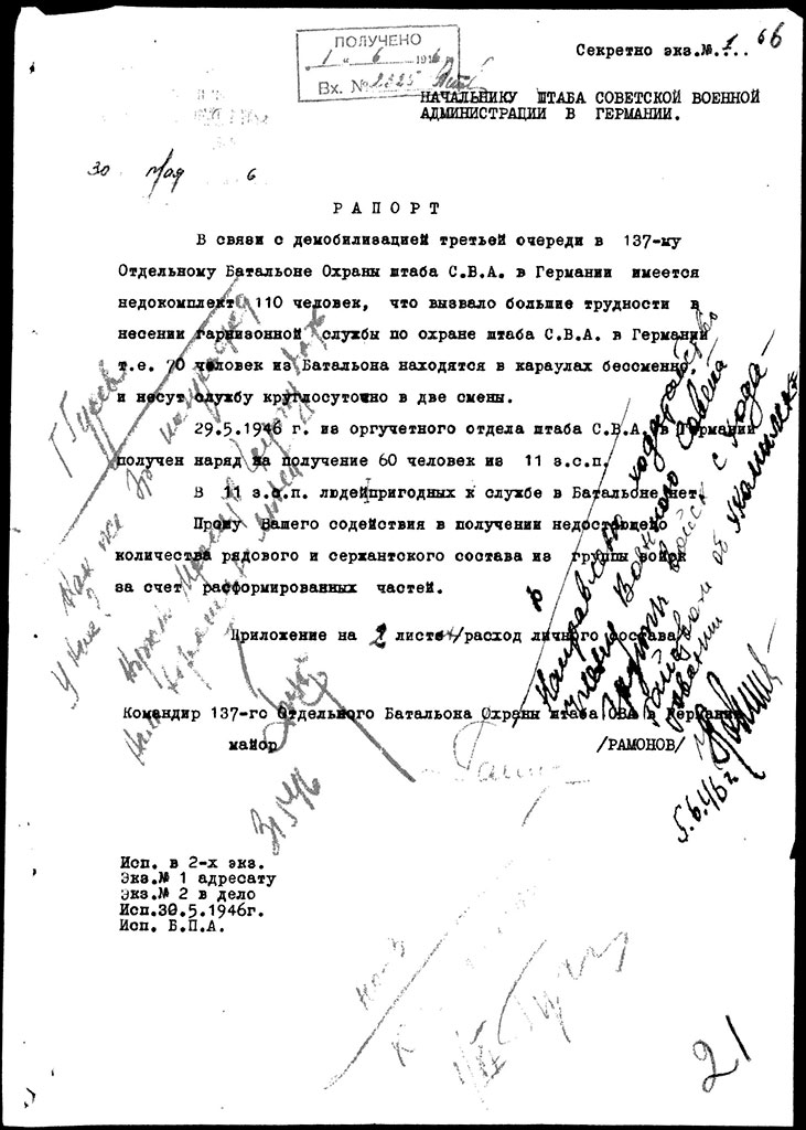 Вызывают интерес рукописные пометы на рапорте. Первая, адресованная начальнику Оргучетного отдела СВАГ полковнику В. К. Гусеву, сделана 31 мая заместителем начальника Штаба СВАГ генерал-лейтенантом Г. С. Лукьянченко, который искренне недоумевает: «Как же это получается у нас? Надо просить Группу дать нам хороших людей». Рядом с этой пометой отписка начальника 3 отделения Оргучетного отдела майора Н. А. Ковалева: «Направлено ходатайство члену Военного Совета Группы войск с ходатайством об укомплектовании». Таким образом запросы пошли по второму кругу.