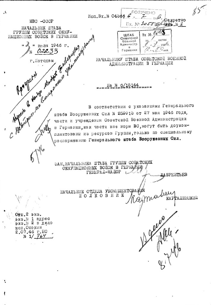 14 Письмо заместителя начальника Штаба ГСОВГ М. А. Лаврентьева и начальника Отдела укомплектования Н. Л. Карталинского начальнику Штаба СВАГ М. И. Дратвину о доукомплектовании частей и учреждений СВАГ из ресурсов ГСОВГ. 03.07.46 г. Подлинник. ГАРФ, ф. 7317, оп. 49, д. 21, л. 85.