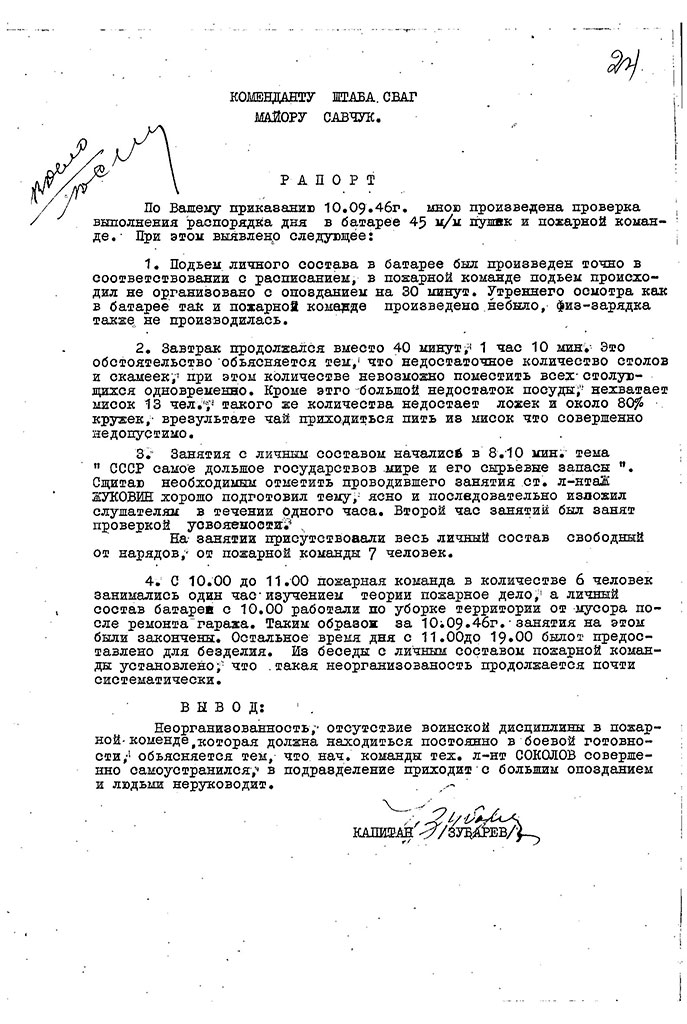 20 Приказ врид военного коменданта Штаба СВАГ А. Д. Савчука № 08 от 13.09.46 г. о мерах по устранению недочетов во внутреннем распорядке и учебе батареи 45-ти мм пушек и пожарной команды. Подлинник. Приложение: рапорт капитана Н. П. Зубарева о результатах проверки выполнения распорядка дня в батарее 45-мм пушек и пожарной команде. Подлинник. ГАРФ. Ф. 7317. Оп. 7. Д. 141. Л. 22-24.