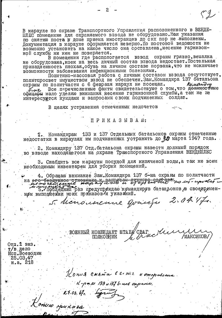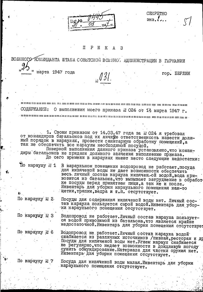 25 Приказ военного коменданта Штаба СВАГ С. С. Максимова № 031 от 25.03.47 г. о мерах по устранению недостатков, выявленных в ходе проверки караульной службы. Подлинник. ГАРФ. Ф. 7317. Оп. 7. Д. 144. Л. 51-52.