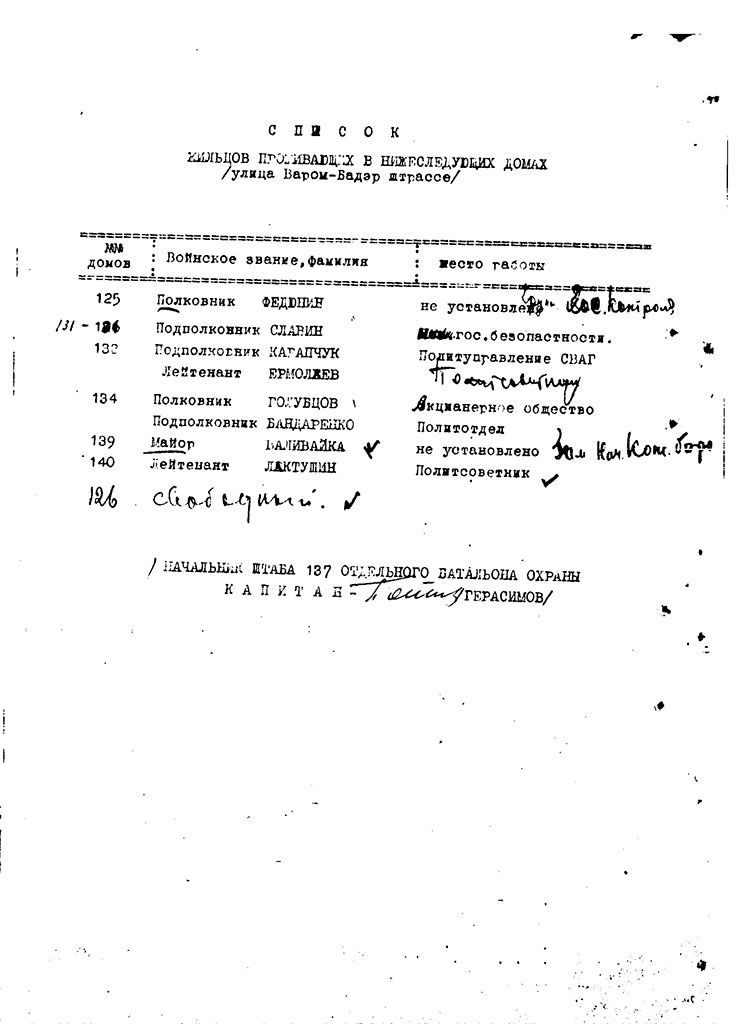 Однако командование 137 обо задолго до появления этих директив пыталось решить возникшую жилищную проблему. Еще 3 апреля 1947 г. командир 137 обо майор Х. Т. Рамонов в своей докладной записке сообщал военному коменданту Штаба СВАГ полковнику С. С. Максимову,37 что офицерский состав батальона расквартирован по всему району Карлсхорст, а часть офицеров проживает у немцев. По мнению Рамонова разбросанность квартир офицерского состава снижала боеготовность батальона, а проживание офицеров среди немцев отрицательно сказывалось на моральной стойкости некоторых из них. Поэтому комбат просил полковника Максимова ходатайствовать перед вышестоящим командованием о предоставлении в распоряжение 137 обо нескольких домов, расположенных на ближайшей к батальону улице Вармбадер штрассе (нынешняя Роберт-Зиверт-штрассе – В. Т.).