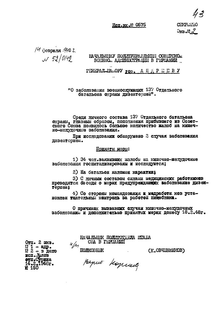 30 Донесение начальника Политического отдела Штаба СВАГ К. В. Овчинникова начальнику Политического управления СВАГ И. М. Андрееву о заболевании военнослужащих 137 обо дизентерией. 14.02.48 г. Заверенная копия. ГАРФ. Ф. 7317. Оп. 7. Д. 133. Л. 43.