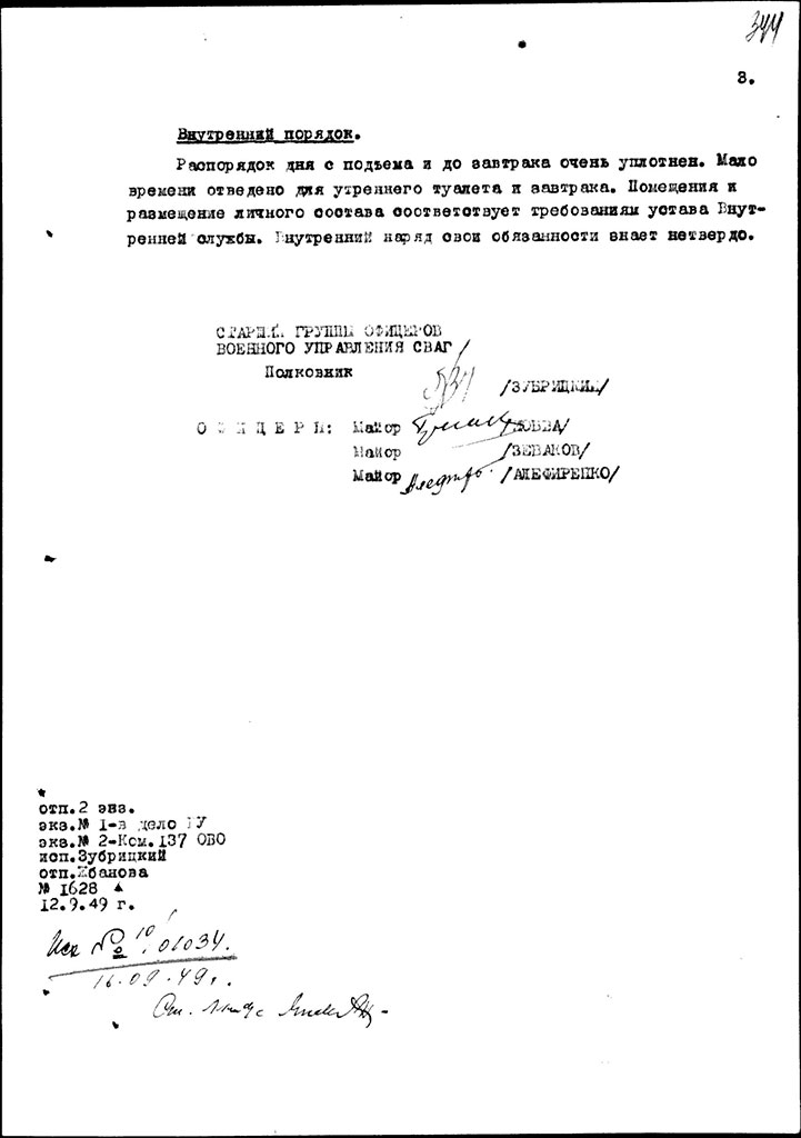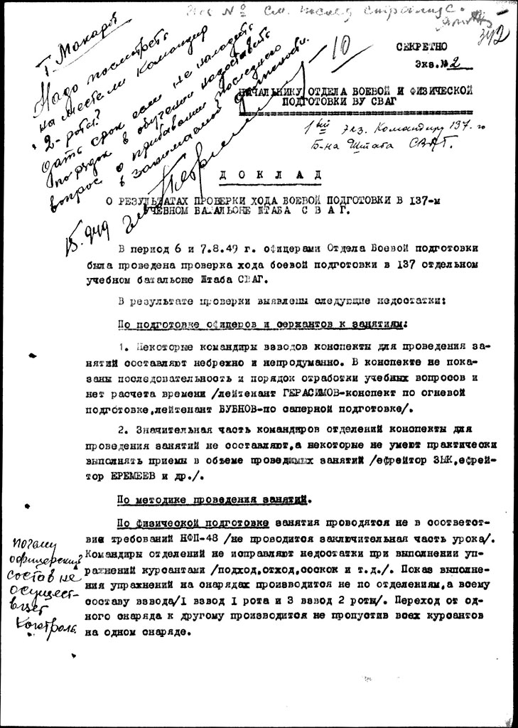 51 Доклад о результатах проверки хода боевой подготовки в 137 учебном батальоне Штаба СВАГ. 16.09.49 г. Подлинник. ГАРФ. Ф. 7317. Оп. 12. Д. 97. Л. 342-344.