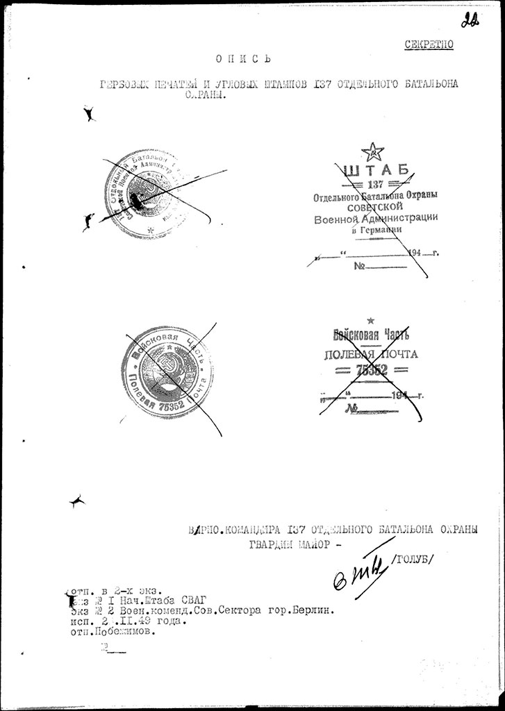 43 Директивное указание начальника Штаба СВАГ № 6/0325 от 11.07.48 г. командирам 133 и 137 обо по охране особо важного хранилища «Бункер». Заверенная копия. ГАРФ, ф. 7317, оп. 7, д. 68, л. 281.