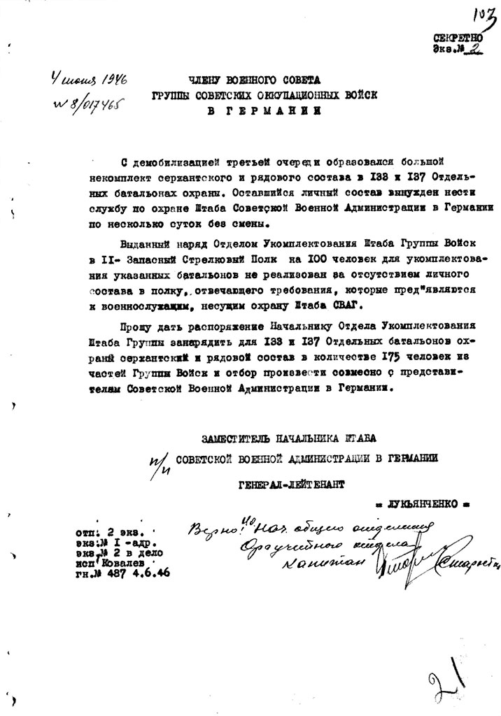 Празднование 9 мая 1946 г. в Карлсхорсте прошло без происшествий. С 12 мая по приказу генерал-лейтенанта М. И. Дратвина развод караулов и смену внутреннего наряда стали производить ежедневно в 20.00. Видимо, командиру 137 отдельного батальона охраны Штаба СВАГ майору А. И. Иванову так и не удалось устранить недостатки, выявленные в ходе апрельской проверки, потому что в мае 1946 г. в командование батальоном вступил майор Х. Т. Рамонов. Однако прежние проблемы никуда не делись. Уже 30 мая новый комбат озадачил вышестоящее командование рапортом, в котором сообщал, что в связи с демобилизацией третьей очереди в батальоне «имеется недокомплект 110 человек, что вызвало большие трудности в несении гарнизонной службы по охране Штаба СВА в Германии, т. е. 70 человек из батальона находятся в караулах бессменно и несут службу круглосуточно в две смены». Днем ранее Оргучетный отдел Штаба СВАГ прислал в батальон наряд на получение в качестве пополнения 60 человек из 11 запасного стрелкового полка. Однако майор Х. Т. Рамонов не без оснований считал, что «в 11 зсп людей, пригодных к службе в батальоне нет» и просил начальника Штаба СВАГ генерал-лейтенанта М. И. Дратвина оказать содействие в получении недостающего количества рядового и сержантского состава из ГСОВГ за счет расформированных частей. Озабоченность Рамонова понятна — от него требовалось ежедневно назначать в Карлсхорст караулы №№ 1, 2, 3, 4, обеспечивать охрану гауптвахты да еще выделять постоянный наряд из 30 человек в комендатуру Штаба СВАГ. В свою очередь в Штабе СВАГ прекрасно понимали обоснованность доводов командира батальона, поэтому в Военный совет ГСОВГ было направлено соответствующее ходатайство за подписью генерал-лейтенанта Г. С. Лукьянченко. Его интересно прочитать полностью.