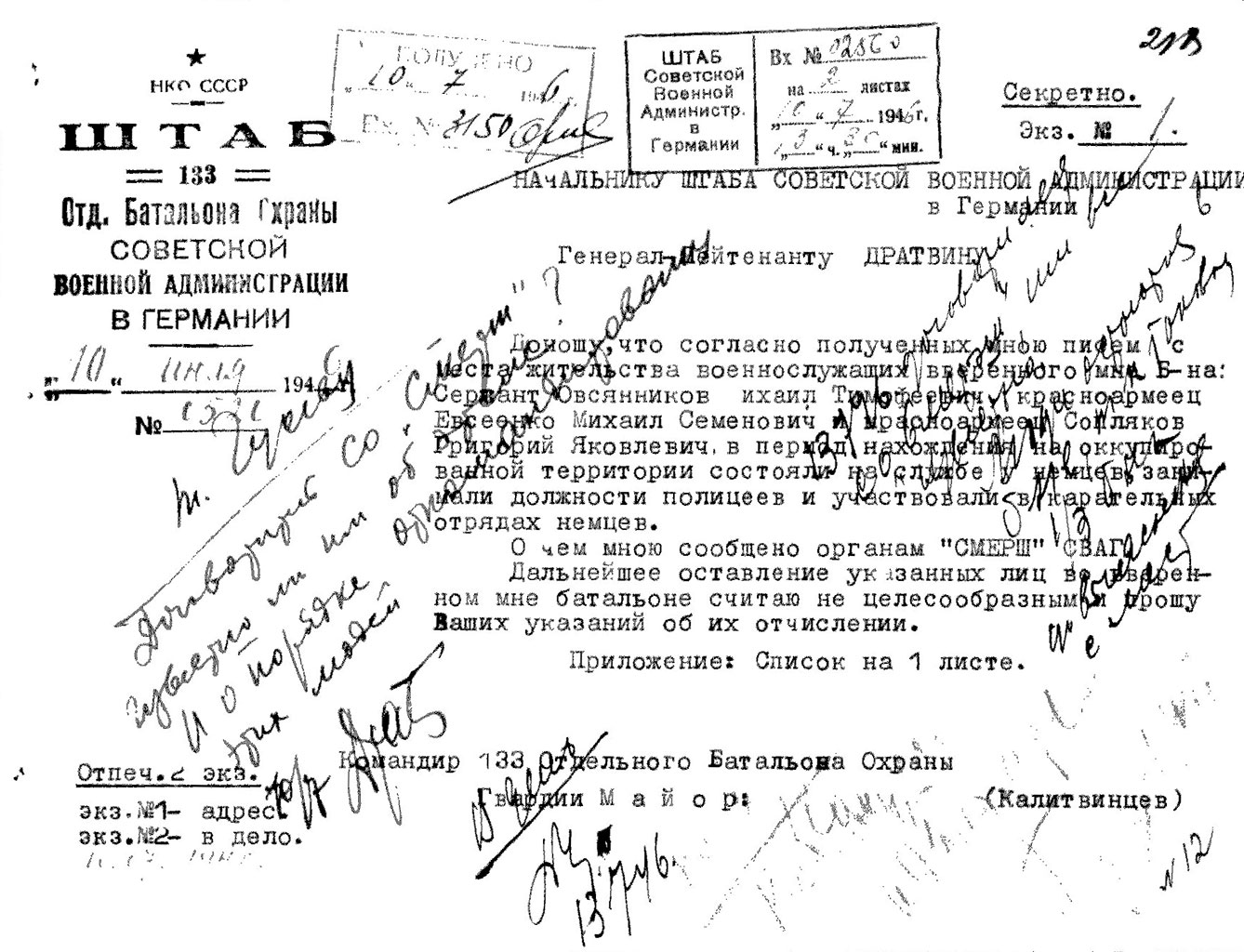 Вскоре был получен ответ за подписью заместителя начальника Штаба ГСОВГ генерал-майора М. А. Лаврентьева, в котором разъяснялось, что в соответствии с указаниями Генерального штаба ВС СССР № 259913 от 27.05.46 г. части и учреждения СВАГ, как части вне норм Вооруженных Сил, могут быть доукомплектованы из ресурсов ГСОВГ только по специальному разрешению Генерального штаба. Для более полного понимания масштабов проблемы достаточно знать, что на 1 июля 1946 г. общий некомплект в частях СВАГ составлял 10826 человек. Поэтому даже батальоны охраны Штаба СВАГ по-прежнему пополнялись, кем придется, вплоть до бывших полицаев и карателей, о чем свидетельствует донесение командира 133 обо майора М. С. Калитвинцева от 10 июля на имя генерал-лейтенанта М. И. Дратвина.