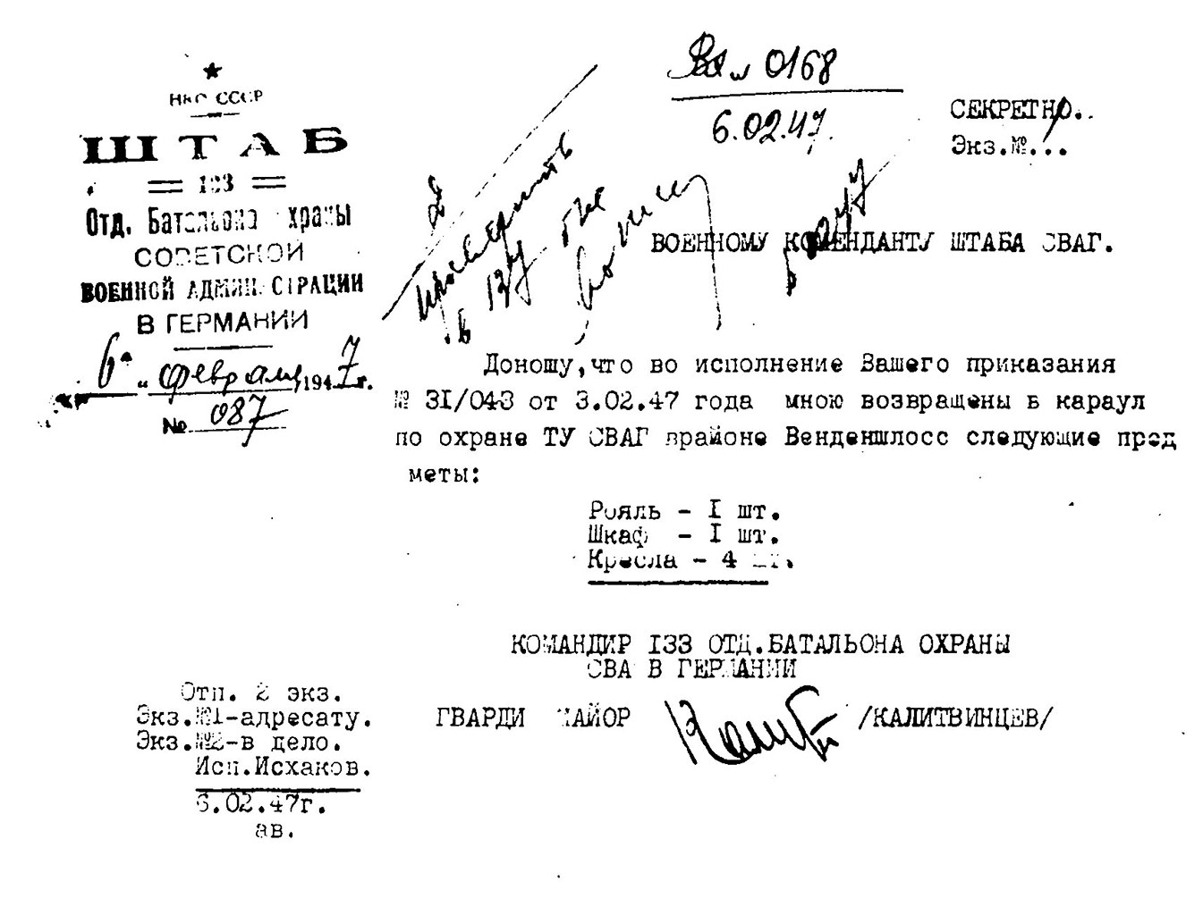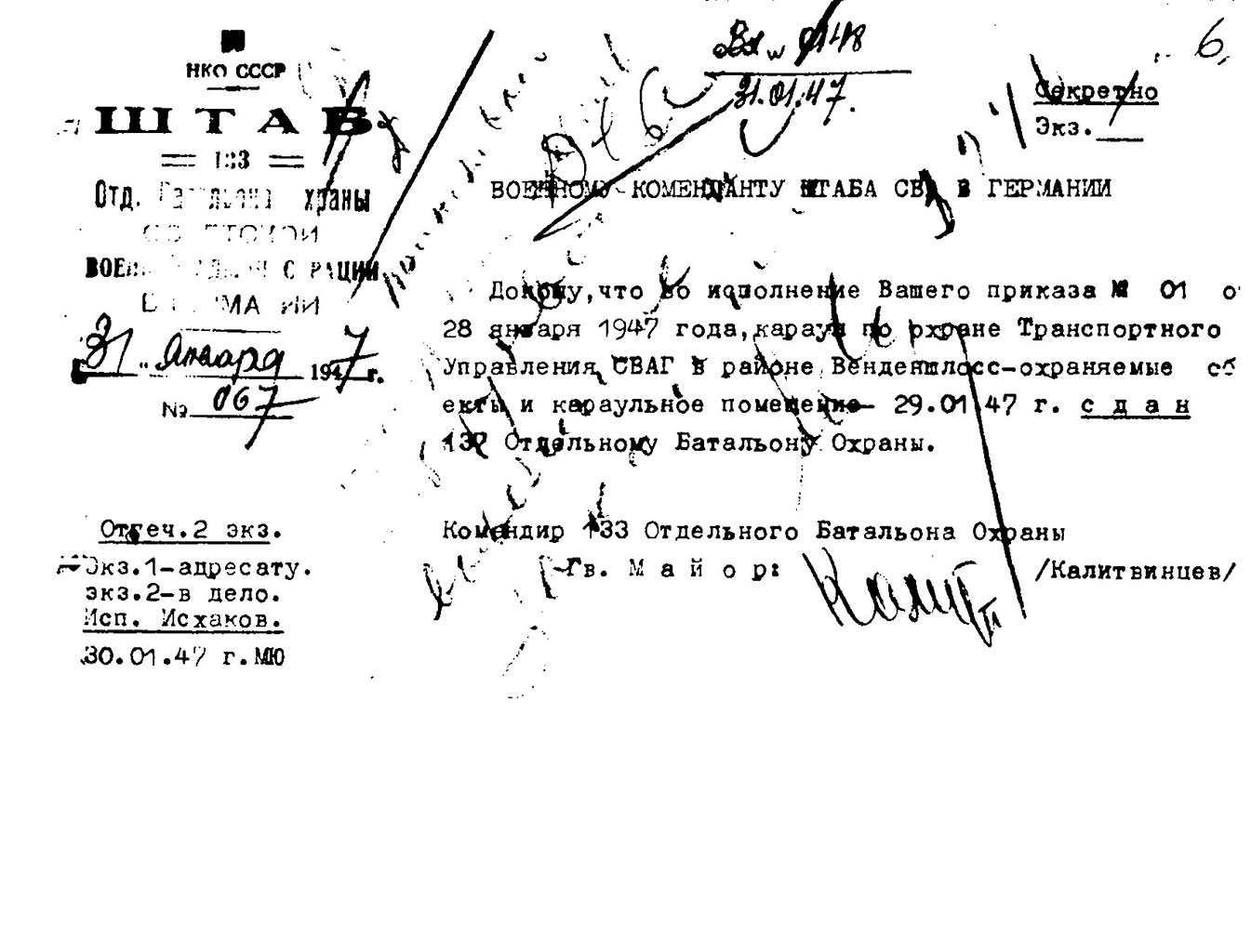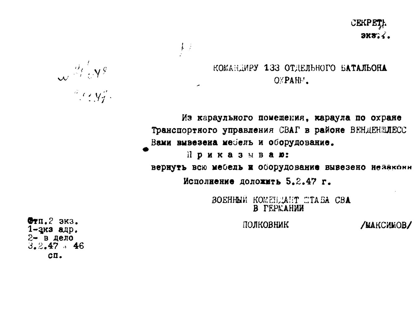 - • Приказание военного коменданта Штаба СВАГ С. С. Максимова № 31/043 от 03.02.47 г. командиру 133 обо о возврате в караульное помещение Транспортного управления СВАГ вывезенного оборудования и мебели. Копия. ГАРФ, ф. 7317, оп. 7, д. 145, л. 7.