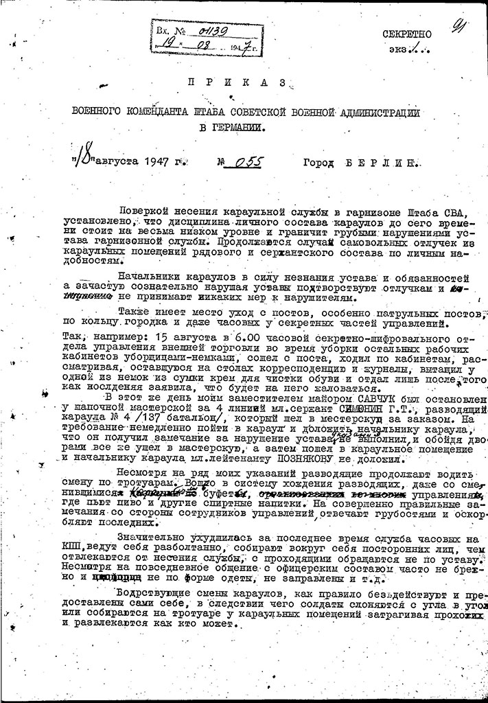 - • Приказ военного коменданта Штаба СВАГ № 055 от 18.08.47 г. об устранении недостатков, выявленных в ходе проверки несения караульной службы в гарнизоне Штаба СВАГ. Подлинник. ГАРФ, ф. 7317, оп. 7, д. 144, лл. 91-93.