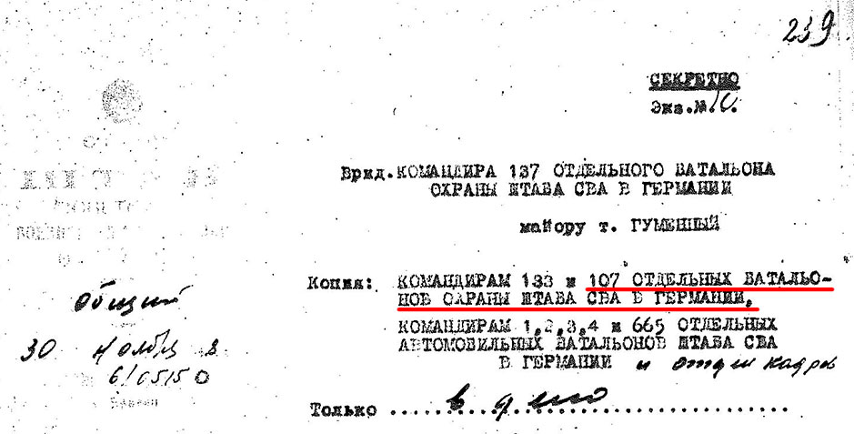 В пользу того, что 107 осб привлекался к гарнизонной службе в Карлсхорсте свидетельствует и то обстоятельство, что в приказе Штабу СВАГ № 044 от 15.09.49 г. о результатах проверки боевой готовности отдельных частей Штаба СВАГ 107 отдельный стрелковый батальон по охране репарационных грузов в портах фигурирует, как отдельный караульный батальон, а в директивном указании начальника Штаба СВАГ № 6/05150 от 30.11.48 г. обозначен, как отдельный батальон охраны Штаба СВАГ. Однако прямого подтверждения того, что 107 осб охранял Штаб СВАГ и другие объекты гарнизона Карлсхорст, пока нет.