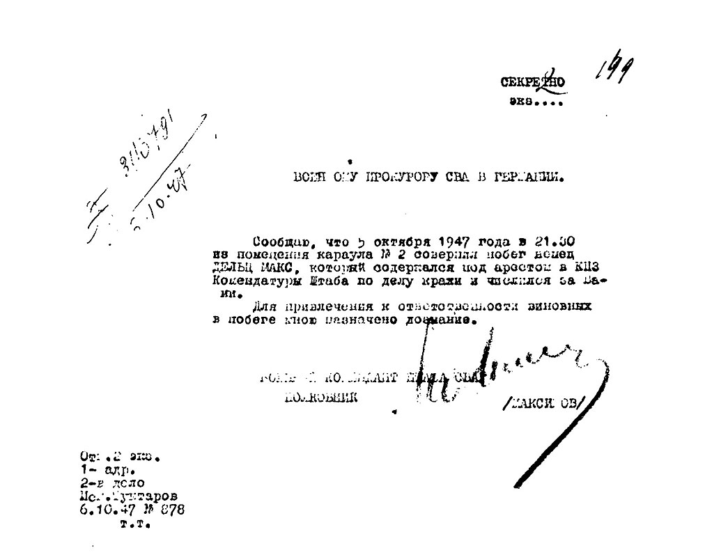 - • Сводное донесение военного коменданта Штаба СВАГ С. С. Максимова от 01.11.47 г. начальнику Организационно-учетного отдела СВАГ о чрезвычайных происшествиях в октябре 1947 г. Подлинник. ГАРФ, ф. 7317, оп. 7, д. 146, лл. 81-82.