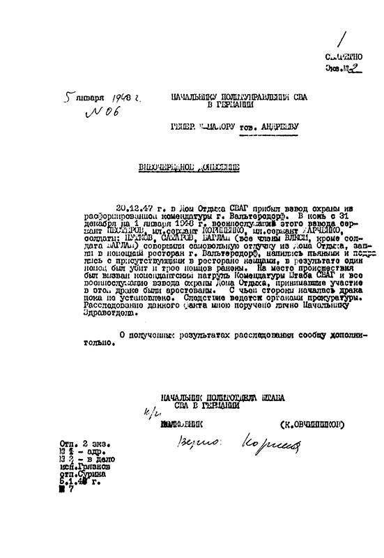- • Донесение начальника Политического отдела Штаба СВАГ К. В. Овчинникова начальнику Политического управления СВАГ И. М. Андрееву от 05.01.48 г. о ЧП в Доме отдыха Вальтерсдорф. Заверенная копия. ГАРФ, ф. 7317, оп. 7, д. 133, л. 1.