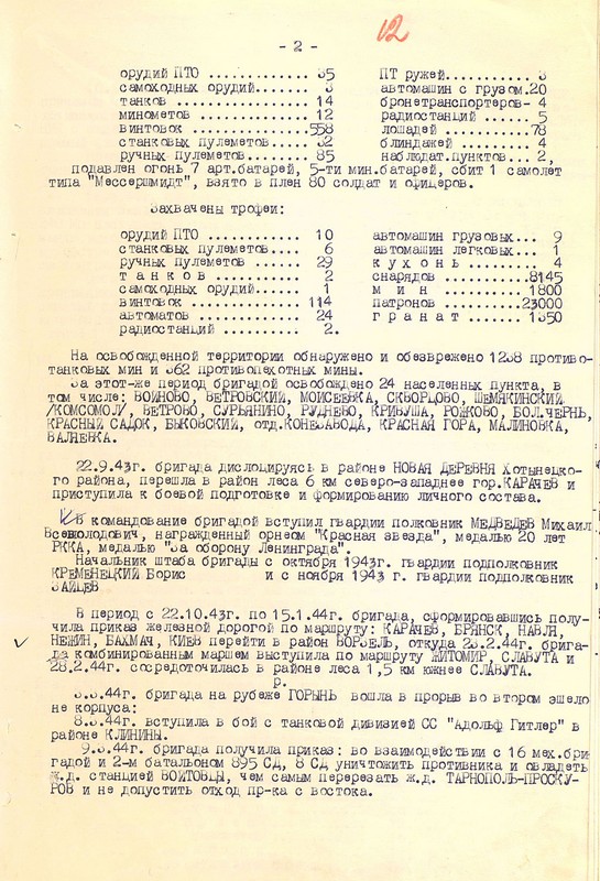 29 апреля 1944 г., при отражении неоднократных атак противника погибли смертью храбрых командир бригады гвардии полковник МЕДВЕДЕВ и командир 1 МСБ гвардии капитан КОСТЕНКО.