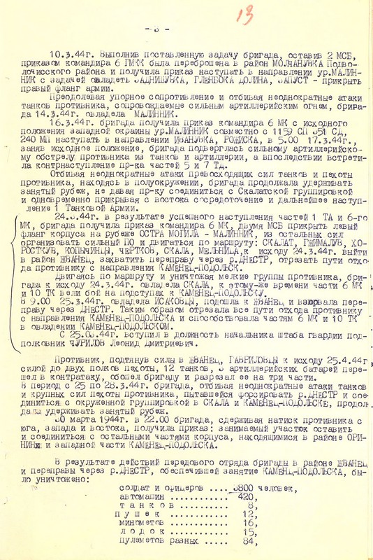 В период с 25 по 28.3.44 г. бригада, отбивая неоднократные атаки танков и крупных сил пехоты противника, пытавшейся форсировать р. ДНЕСТР и соединиться с окруженной группировкой в СКАЛА и КАМЕНЕЦ-ПОДОЛЬСКЕ, продолжала удерживать занятый рубеж.
