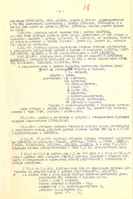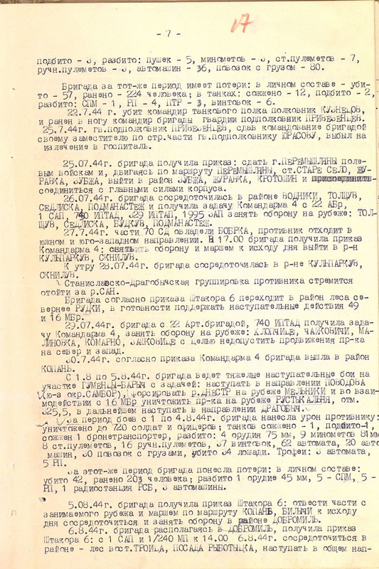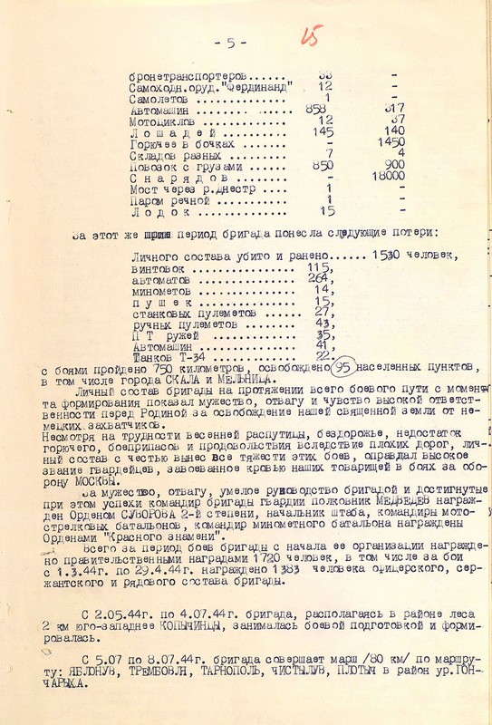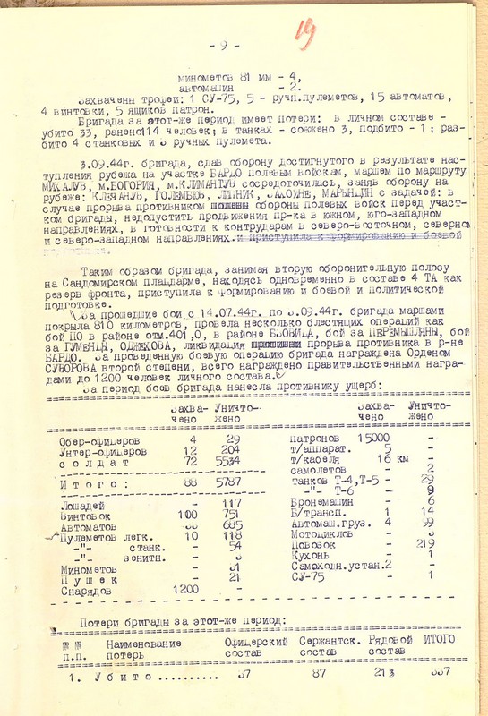 За тот же период бригада имеет потери: убито 103, ранено 330 человек; сожжено танков Т-34 – 3, разбито орудий 57 мм – 2, орудий 76 мм – 1, автомашин – 4, ст. пулеметов – 3, минометов 82 мм – 2, РП – 10, автоматов – 25.