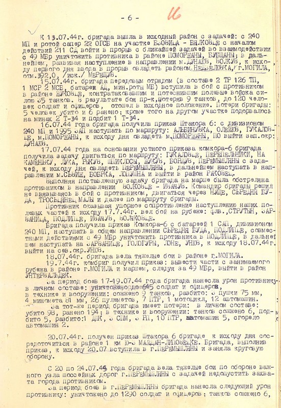 30.4.44 г. после десятидневных упорных боев бригада занимаемый участок передала 21 мехбригаде, маршем вышла в район КОПЫЧИНЦЫ и приступила к боевой подготовке и формированию личного состава бригады.
