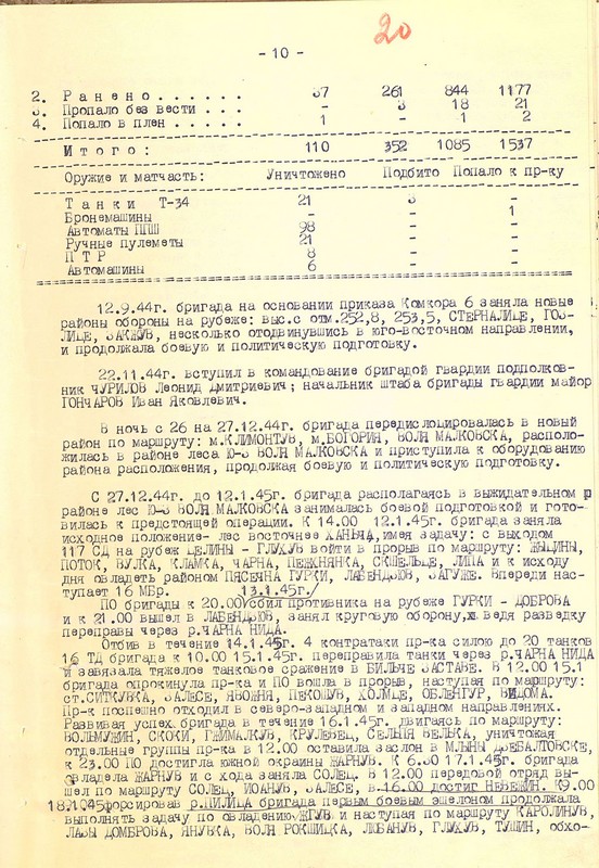 Приказом Верховного Главнокомандующего за № 014 от 19.2.45 г. бригаде присвоено наименование – «Петроковская».13