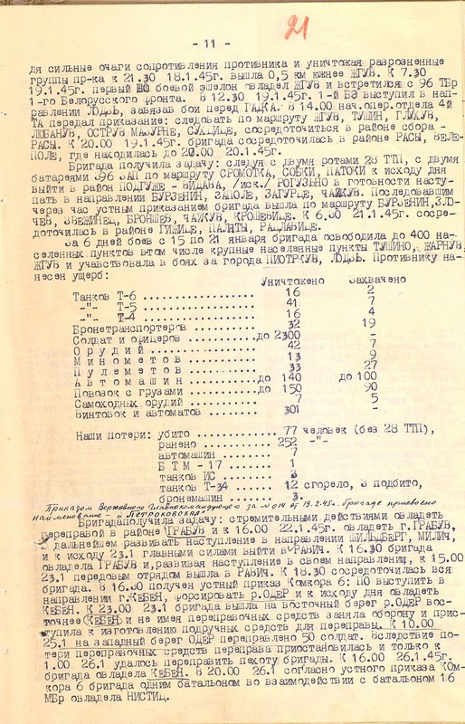 Бригада получила задачу: стремительными действиями овладеть переправой в районе ГРАБУВ и к 16.00 22.1.45 г. овладеть г. ГРАБУВ, в дальнейшем развивать наступление в направлении ШИЛЬБЕРГ, МИЛИЧ и к исходу 23.1 главными силами выйти к РАВИЧ. К 16.30 бригада овладела ГРАБУВ и, развивая наступление в своем направлении, к 15.00 23.1 передовым отрядом вышла в РАВИЧ. К 18.30 сосредоточилась вся бригада. В 16.30 получен устный приказ Комкора 6: ПО выступить в направлении г. КЕБЕН, форсировать р. ОДЕР и к исходу дня овладеть КЕБЕН. К 23.00 23.1 бригада вышла на восточный берег р. ОДЕР восточнее КЕБЕН и, не имея перепраочных средств, заняла оборону и приступила к изготовлению подручных средств для переправы. К 10.00 25.1 на западный берег ОДЕР переправлено 50 солдат. Вследствие потери переправочных средств переправа приостановилась, и только к 1.00 26.1 удалось переправить пехоту бригады. К 16.00 26.1.45 г. бригада овладела КЕБЕН. В 20.00 26.1 согласно устного приказа Комкора 6 бригада одним батальоном во взаимодействии с батальоном 16 МБр овладела НИСТИЦ.