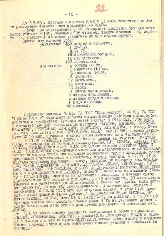 ;В 21.30 8.2.45 г. бригада вошла в прорыв на участке БЕЙТХАУ, ПОЛАХ и, следуя за ПО 16 МБр по маршруту РАУДТЕН, БОРШАУ, ЗУККАУ, ГЕРЦОПОЛЬ, КУНЦЕНДОРФ, к 8.30 9.02 передовым отрядом достигла ТАММ. К 9.00 10.2 бригада гусеничными машинами сосредоточилась кол. НЕЙХАЙДАУ. Колесные машины, отставшие на марше вследствие трудно проходимых дорог, продолжали подтягиваться к передовому отряду бригады. В 17.00 10.2 бригада, продолжая выполнять задачу, наступая по маршруту кол. НЕЙХАЙДАУ, КЛЕЙН ГЛЕСЕРДОРФ, ЦАЙСДОРФ, ХИРТСДОРФ, НИДЕР, ХИРФЕЛЬДАУ, ШЕНБРУН, КАЛЬКРЕЙТ, РЕНГЕНСДОРФ, к 9.00 11.2 головой достигла НИДЕР-ГРОППЕ и с хода форсировала р. БОБЕР, овладев плацдармом на западном берегу – ГЛАДИСГОРПЕ, ведя бои за удержание плацдарма. В течение суток уничтожено до 200 солдат и офицеров, до 15 мотоциклов, 50 велосипедов, захвачено и уничтожено до 30 автомашин с различным грузом. Наши потери: убито 10, ранено 35, сожжен бензовоз, 3 автомашины, подбито 2 автомашины. В 22.00 12.2 бригада получила задачу: к утру 13.2 прикрыть правый фланг 4 ТА на рубеже 1 км севернее НИДЕР БРИСНИЦ, по ручью БРИСНИЦ на С-З, отм. 103,6, ГУТЕНТАЛЬ, до р. БОБЕР. К 12.00 13.2 бригада частью сил прикрыла правый фланг 4 ТА на указанном рубеже и одним батальоном вела бои по расширению плацдарма на восточной окр. БЕНАУ.