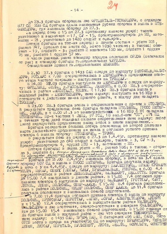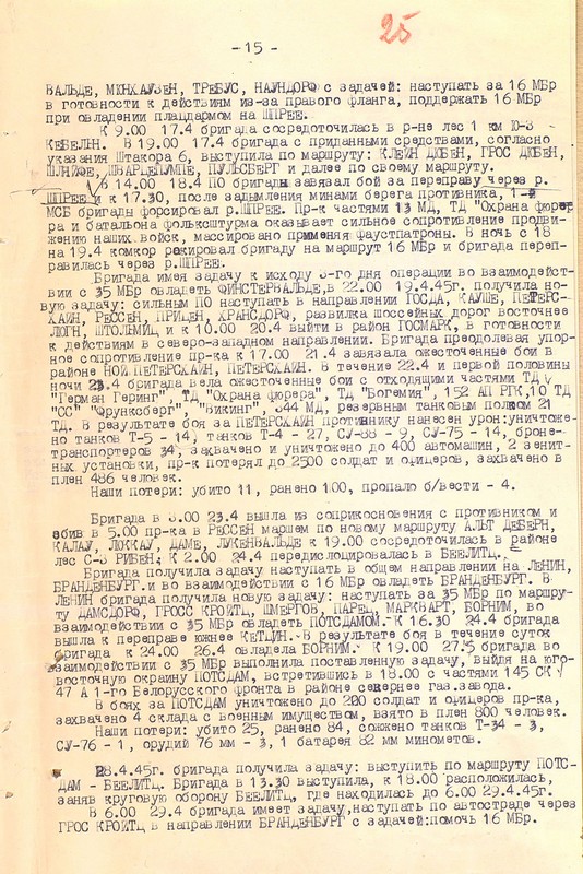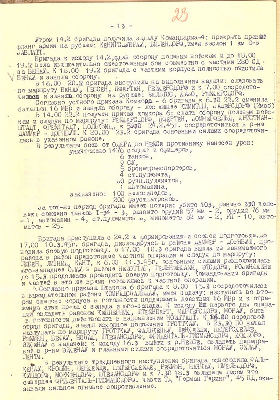 В 6.00 29.4 бригада имеет задачу наступать по автостраде через ГРОС[C] КРОЙТЦ в направлении БРАНДЕНБУРГ с задачей помочь 16 МБр. Ведя трудные тяжелые бои в лесистой местности, бригада к 13.30 30.4.45 г. опрокинула противника и, следуя по маршруту, получила задачу сосредоточиться в районе ДАМСДОРФ – ЛЕНИН и занять круговую оборону, перекрыв все дороги. К 18.00 30.4.45 г. бригада заняла оборону [у]казанных районов.