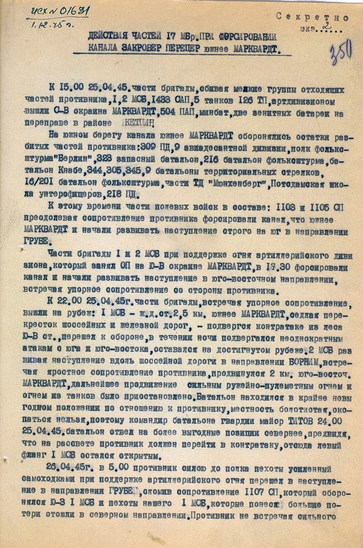 К 22.00 25.04.45 г. части бригады, встречая упорное сопротивление, вышли на рубеж: 1 МСБ — ж. д. ст. 2,5 км южнее МАРКВАРДТ, седлая перекресток шоссейной и железной дорог, — подвергся контратаке из леса Ю-В ст., перешел к обороне, в течение ночи подвергался неоднократным атакам с юга и юго-востока, оставался на достигнутом рубеже. 2 МСБ развивая наступление вдоль шоссейной дороги в направлении БОРНИМ, встречая яростное сопротивление противника, продвинулся 2 км. юго-восточ. МАРКВАРДТ, дальнейшее продвижение сильным ружейно-пулеметным огнем и огнем из танков было приостановлено. Батальон находился в крайне невыгодном положении по отношению к противнику, местность болотистая, окопаться нельзя, поэтому командир батальона гвардии майор ТИТОВ 24.00 25.04.45. батальон отвел на более выгодные позиции севернее, предвидя, что на рассвете противник должен перейти в контратаку, отсюда левый фланг 1 МСБ остался открытым.