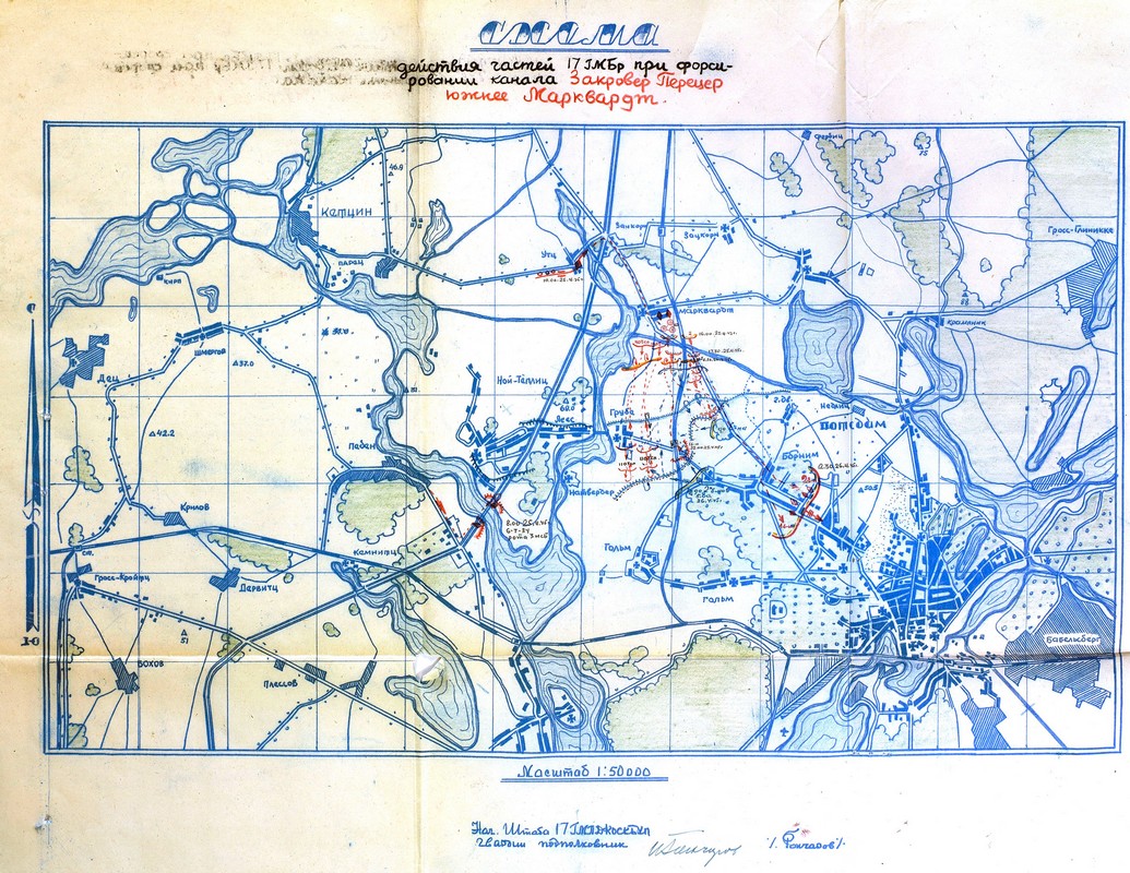 Части бригады 1 и 2 МСБ при поддержке огня артиллерийского дивизиона, который занял ОП на Ю-В окраине МАРКВАРДТ, в 17.30 форсировали канал и начали развивать наступление в юго-восточном направлении, встречая упорое сопротивление со стороны противника.