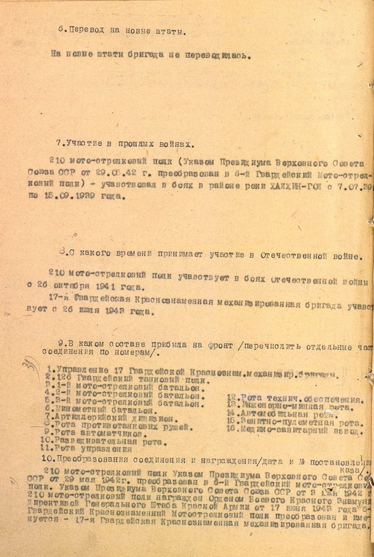 210 мото-стрелковый полк Указом Президиума Верховного Совета Союза ССР от 29 мая 1942 г. преобразован в 6-й Гвардейский мото-стрелковый полк. Указом Президиума Верховного Совета Союза ССР от 3 мая 1942 г. 210 мото-стрелковый полк награжден Орденом Боевого Красного Знамени. Директивой Генерального Штаба Красной Армии от 17 июня 1943 года 6-й Гвардейский Мотострелковый полк преобразован и именуется — 17-я Гвардейская Краснознаменная механизированная бригада.4
