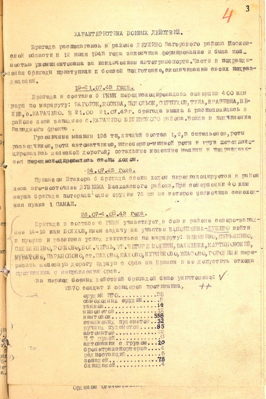 Бригада согласно приказа Штакора-6 снята с участка обороны и маршем вышла в район леса северо-западнее 6 клм г. Карачев и приступила к формированию.