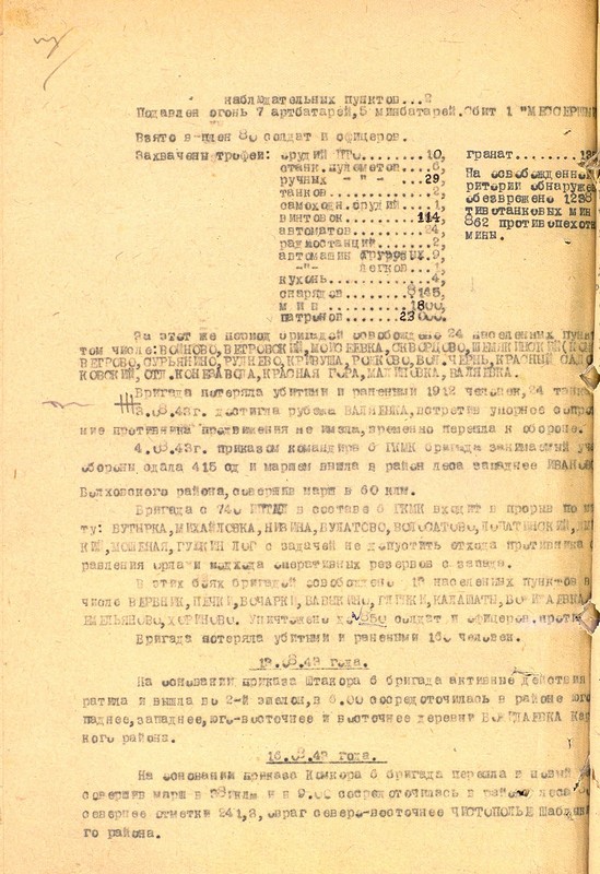 В этих боях бригадой освобождено 13 населенных пунктов в [том] числе ВЕРБНИК, ПЕЧКИ, БОЧАРКИ, БЫВЫКИНО, ГЛИНКИ, КАЛАШАТЫ, БОЖИДАЕВКА, ЕМЕЛЬЯНОВО, ХОРИНОВО. Уничтожено до 850 солдат и офицеров противника.