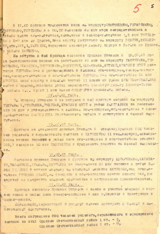 Не вступив в бой, бригада согласно приказа Штакора-6 19.08.43 года форсированным маршем на расстоянии 62 клм по маршруту ГАВРИЛОВО, ГЕРАСИМОВО, ИВАНОВКА, ПЕТРУШКОВО, КОСУЛИЧИ, ЯБЛОЧКОВО, АРТЮХИ, КРАСНЫЕ ЯСЛИ достигла ПЕТРОВО 2-е и расположилась в лощинах юго-западнее, северо-западнее, северо-восточнее и юго-восточнее ПЕТРОВО 2-е юго-восточнее 44 клм БРЯНСКА, имея задачу с выходом частей 11 Армии на рубеж ВРАЖИНО-ИВАНОВКА войти в прорыв, развивая успех, перерезать железную дорогу Брянск-Льгов в районе ж. д. будки 1 клм южнее СИНЕЗЕРКИ Брянского района.