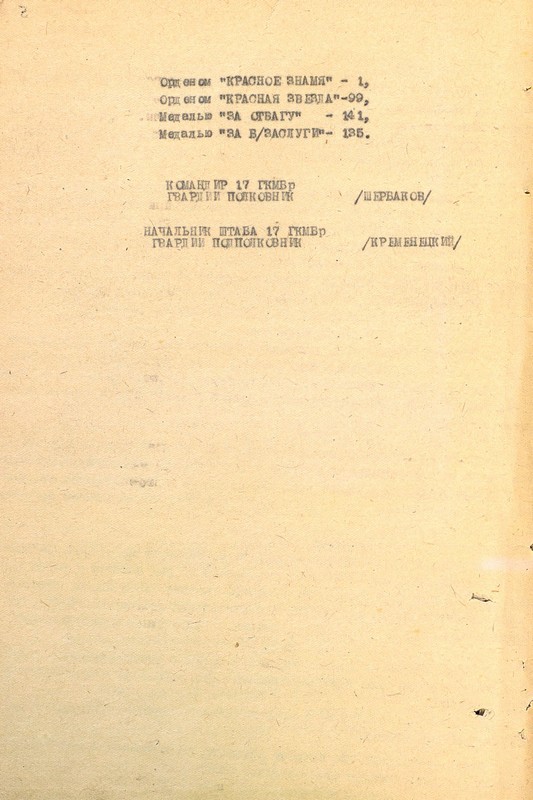 | КОМАНДИР 17 ГКМБр ГВАРДИИ ПОЛКОВНИК / ЩЕРБАКОВ / НАЧАЛЬНИК ШТАБА 17 ГКМБр ГВАРДИИ ПОДПОЛКОВНИК / КРЕМЕНЕЦКИЙ / 9 |