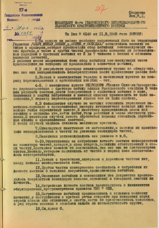 1. По выходе из района наиболее напряженных боев на территории Германии /МЛИЧ, БЕНАУ, КЕБЕН, р. ШПРЕЕ, г. ПОТСДАМ/ оставлялись команды во главе с офицером, которые производили сбор погибших военнослужащих нашей бригады, а также и других частей, производили похороны их установленным порядком в братских могилах от 2 до 7 человек в каждой с отданием воинских почестей. В районах менее напряженных боев сбор погибших военнослужащих также производился, но похороны их производили в одиночных могилах.