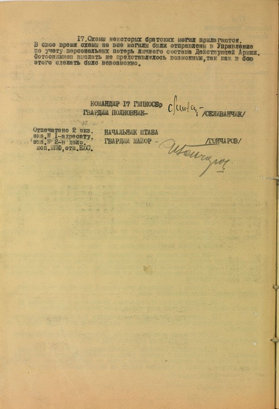 17. Схемы некоторых могил прилагаются. В свое время схемы на все могилы были отправлены в Управление по учету персональных потерь личного состава Действующей Армии. Фотоснимков выслать не представлялось возможным, так как в бою этого сделать было невозможно.