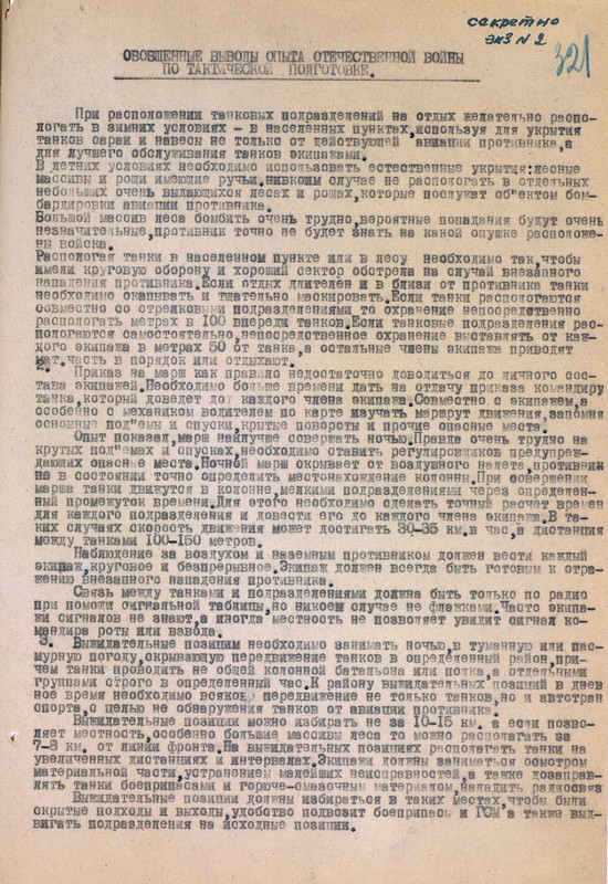 3. Выжидательные позиции необходимо занимать ночью, в туманную или пасмурную погоду, скрывающую передвижение танков в определенный район, причем танки проводить не общей колонной батальона или полка, а отдельными группами строго в определенный час. К району выжидательных позиций в дневное время необходимо [исключить] всякое передвижение не только танков, но и автотранспорта с целью необнаружения танков от авиации противника.