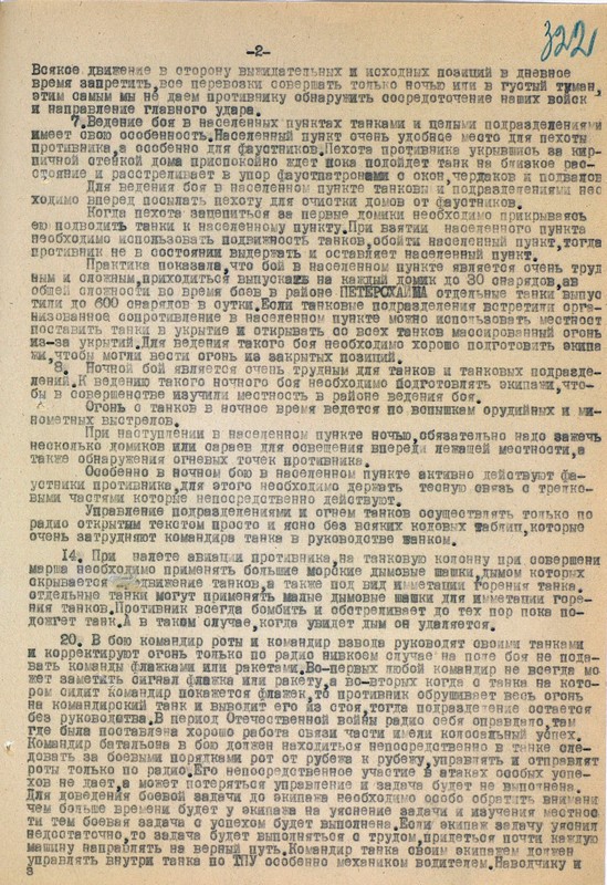 8. Ночной бой является очень трудным для танков и танковых подразделений. К ведению такого ночного боя необходимо подготавливать экипажи, чтобы [они] в совершенстве изучили местность в районе ведения боя.