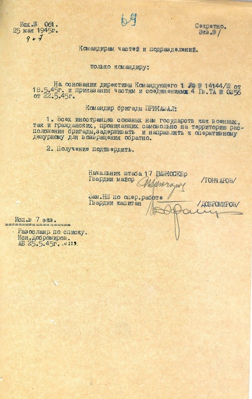 1. Всех иностранцев союзных нам государств как военных, так и гражданских, проникших самовольно на территорию расположения бригады, задерживать и направлять к оперативному дежурному для возвращения обратно.