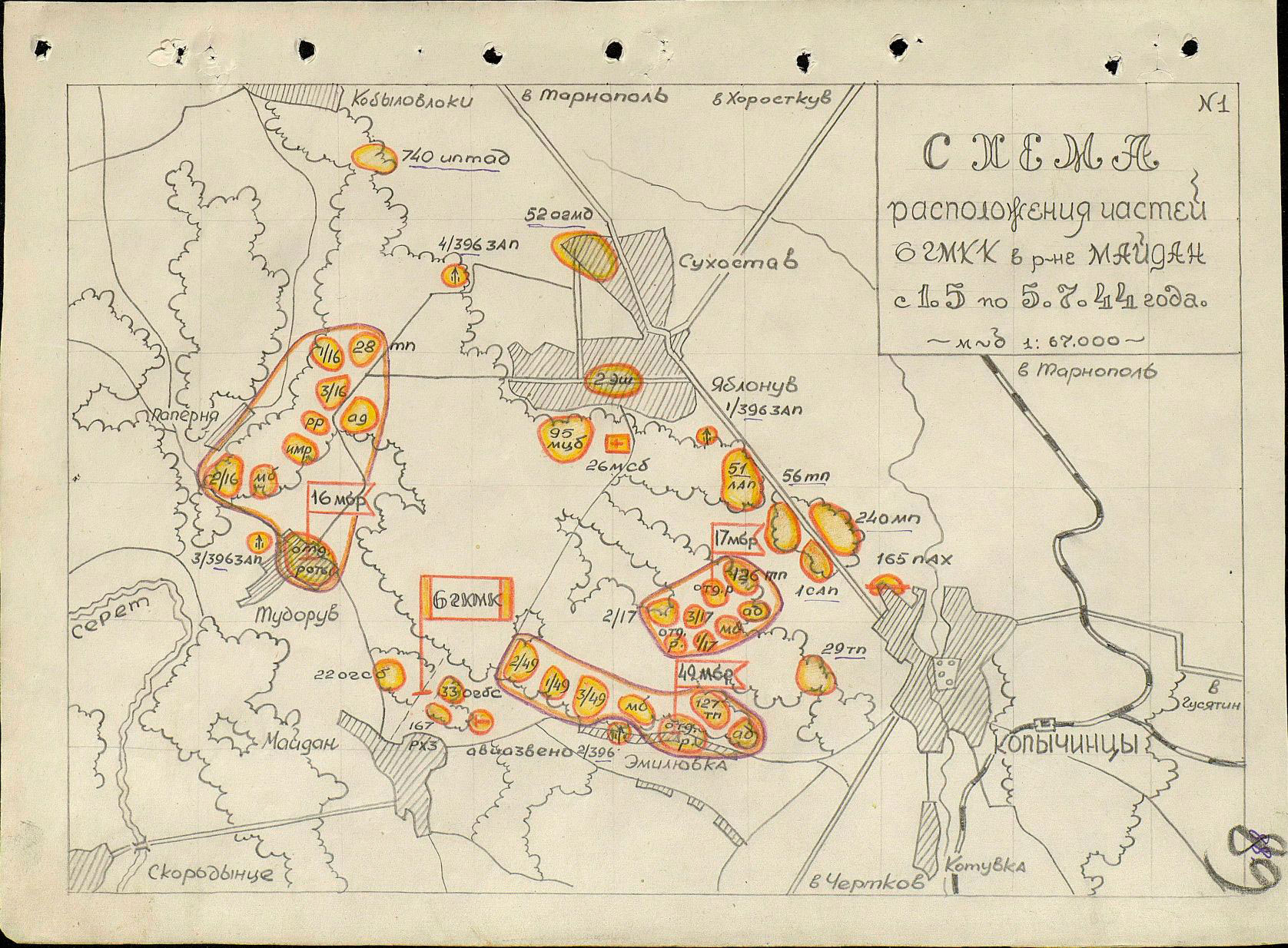 Расположение частей 6 гв. мехкорпуса в районе Майдан 1-5 июля 1944 г.
