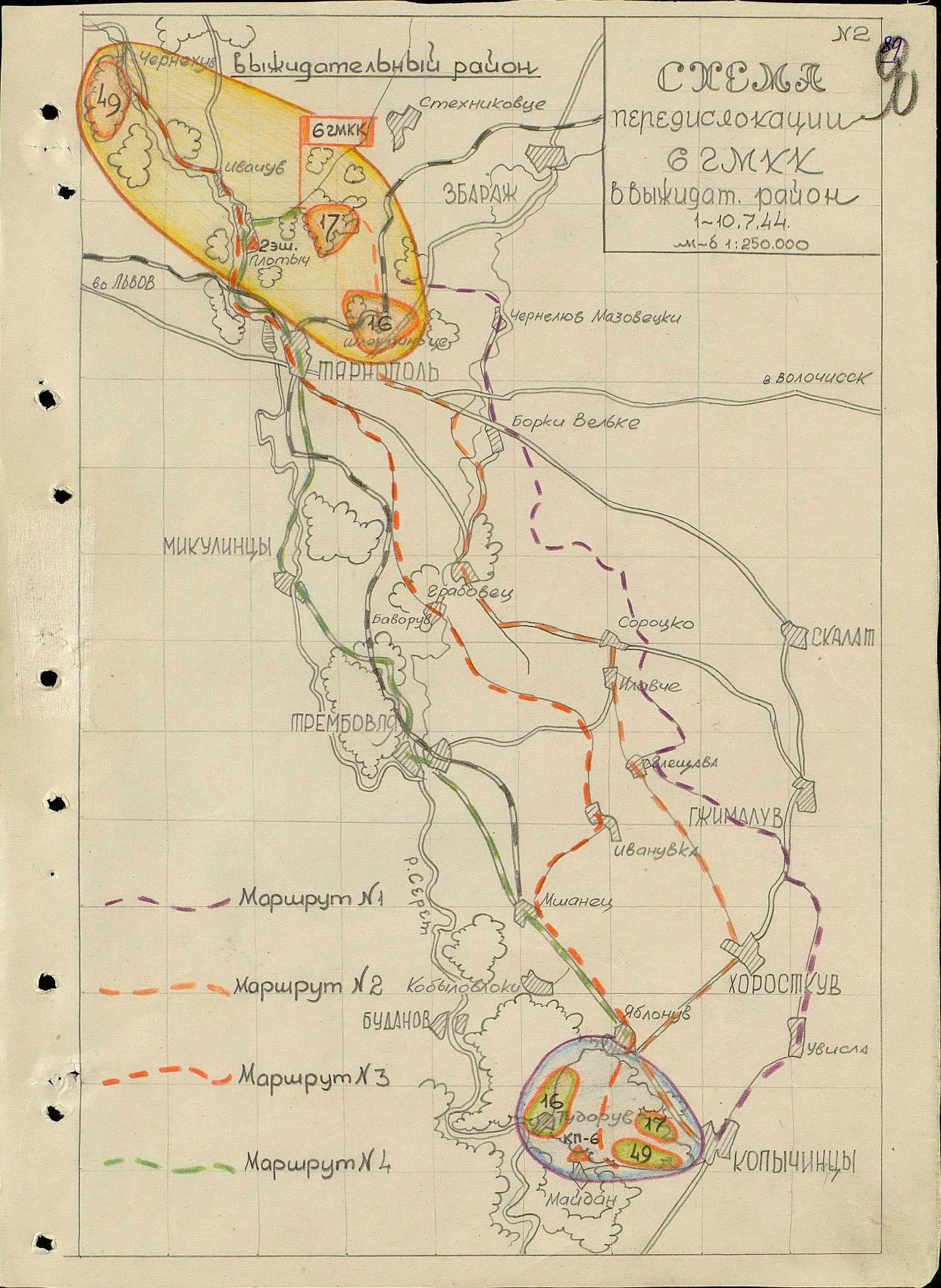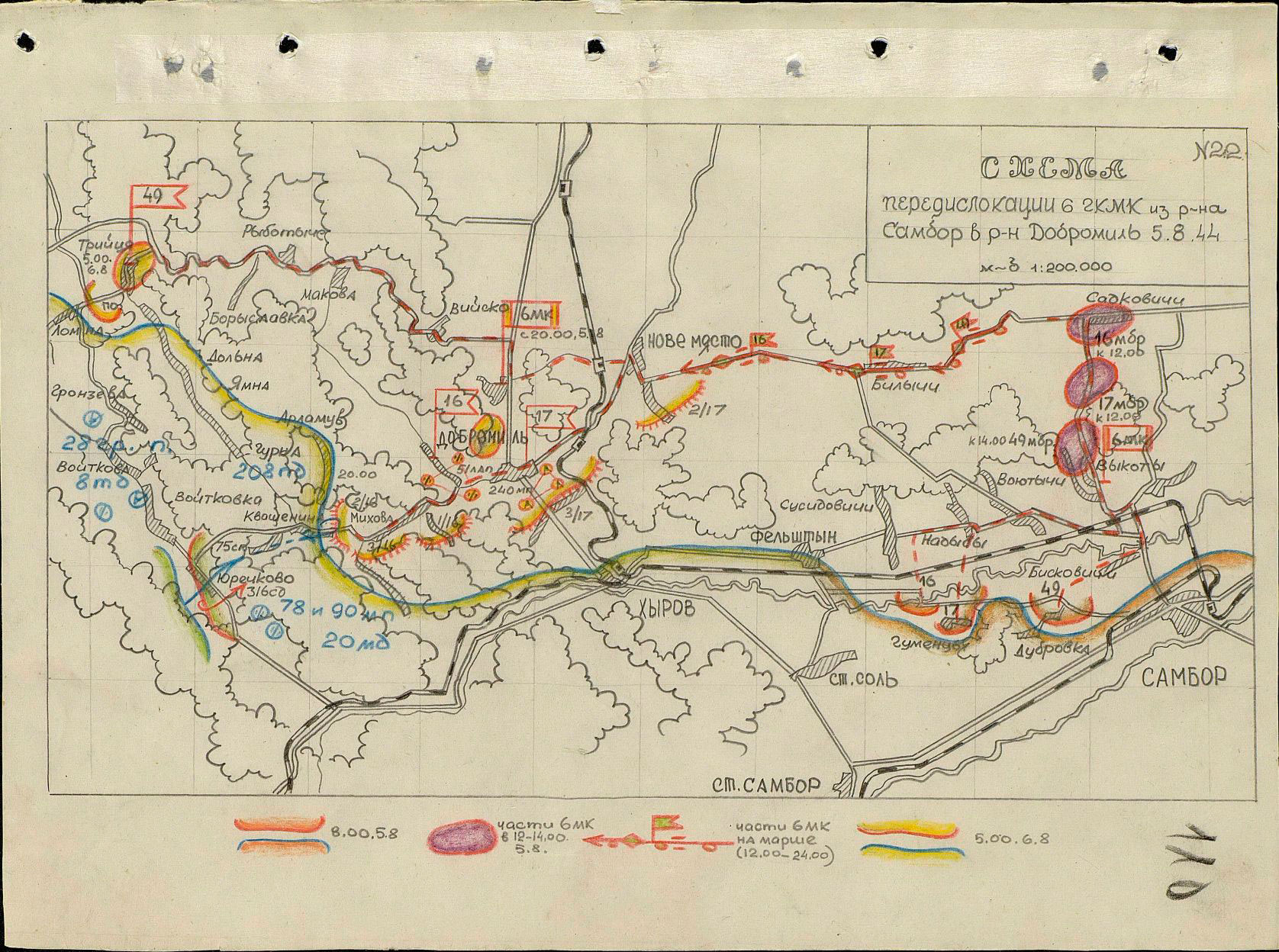 Главными силами корпуса совершить марш в ночное время в период с 4.7 по 10.7.44 г. по четырем маршрутам с дневками в районах: № 1 — СОРОЦКО, ТРЕМБОВЛЯ, ЛОЗУВКА, (иск.) ПЕРЕМИЛУВ; № 2 — СМЫКОВЦЕ, ГАЙЕ-ВЕЛЬКЕ, ПРОШОВА, ГРАБОВЕЦ (см. схему № 2).