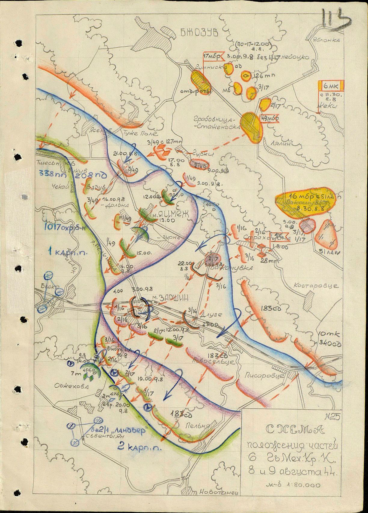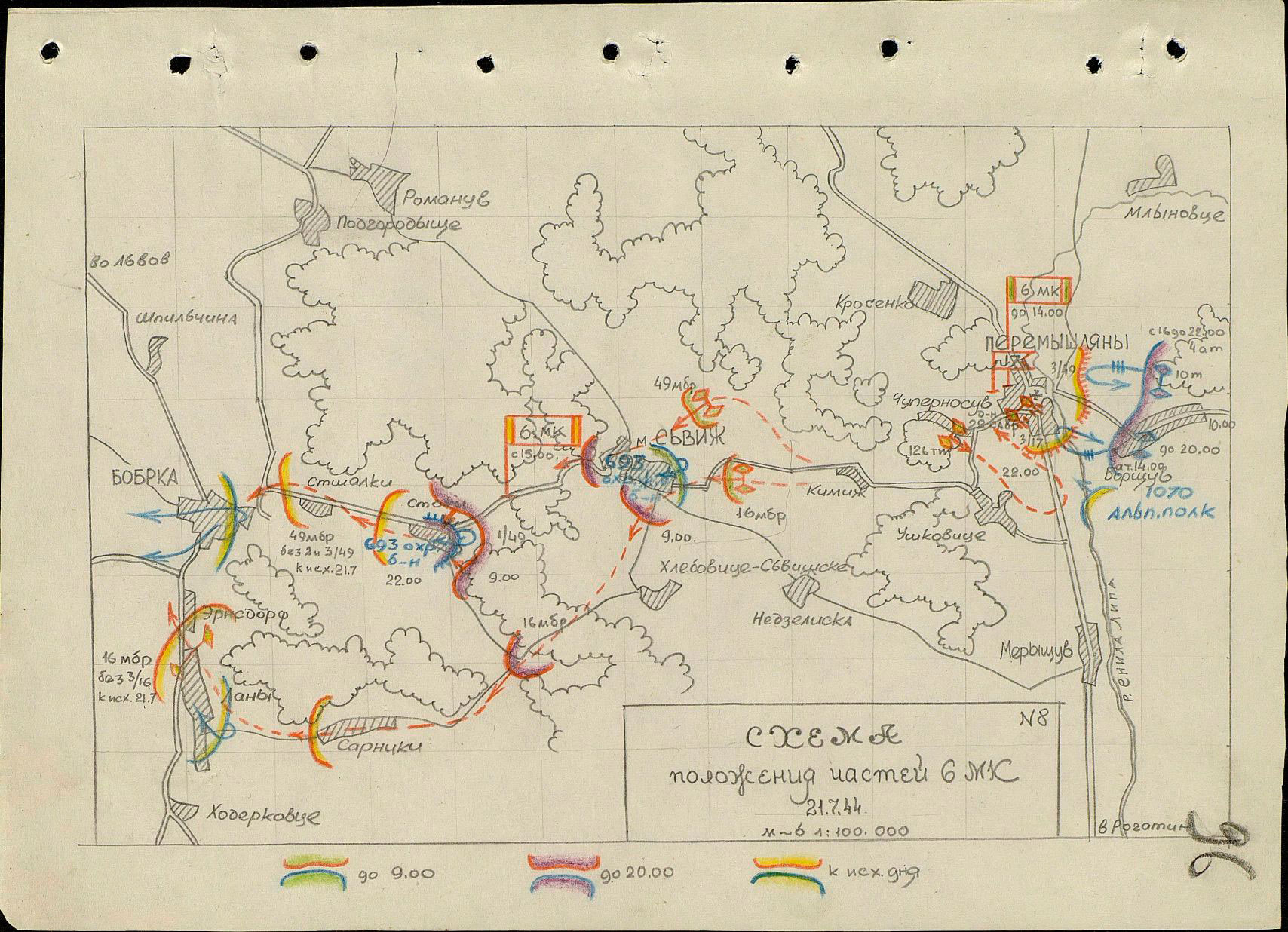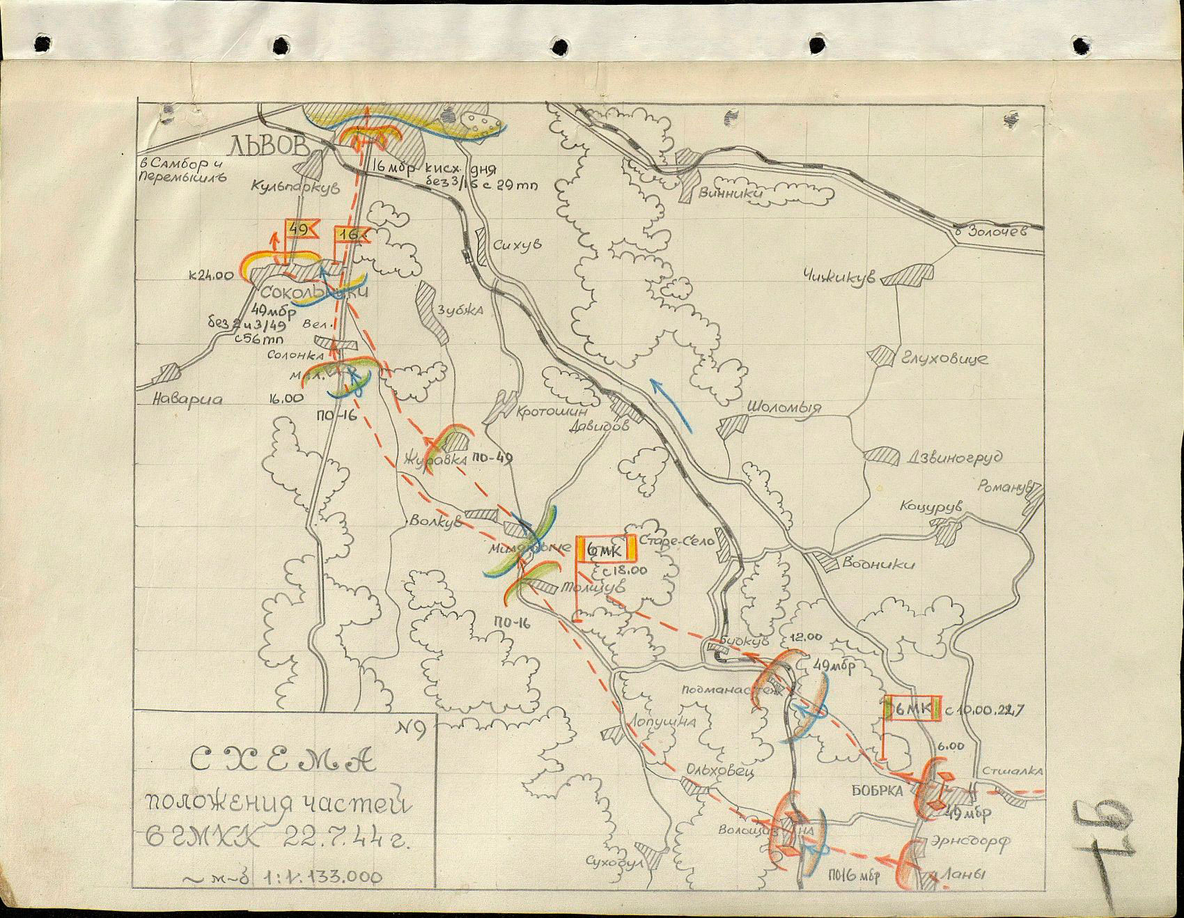 Танковые полки мехбригад к утру 9.7 прибыли в район сосредоточения бригад в полном составе. 29 тп к 24.00 8.7 сосредоточился на южн.окр. ШЛЯХЦИНЬЦЕ; 56 тп на сев. опушке леса ур. ГОНЧАРЫХА к 5.00 9.7.44 г. 51 лап после ночного марша к 2.00 9.7 на сев.-зап. опушке леса, что юго-зап. ЧЕРНЕХУВ. 740 оиптад с утра 8.7 мелкими группами совершил марш и к 14.00 8.7 занял ОП на юго-зап. окр. ВОРОБИЮВКА.8 52 огмд мелкими группами в течение дня совершил марш и к 20.00 8.7 полностью сосредоточился в лесу ур. СРЕДНИ ГАЙ (сев.-вост. ЯНКОВЦЫ).