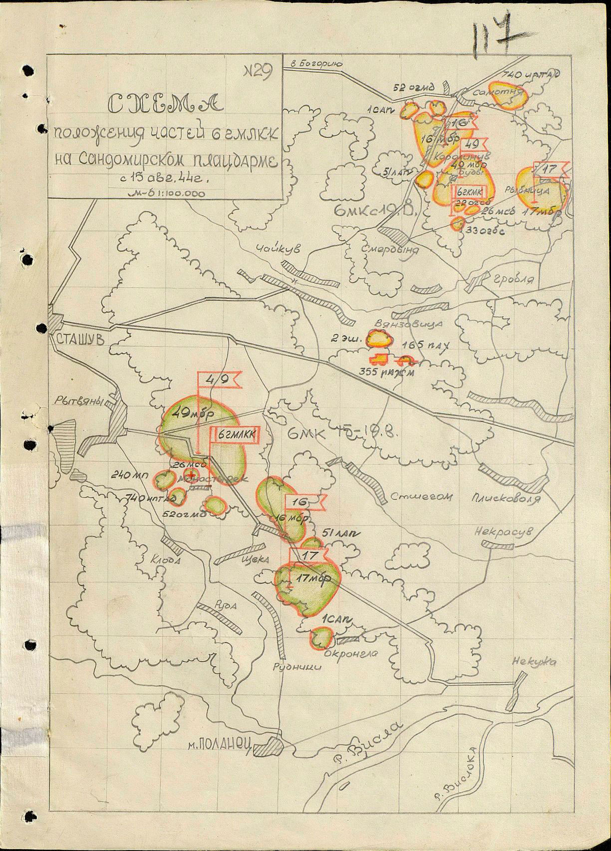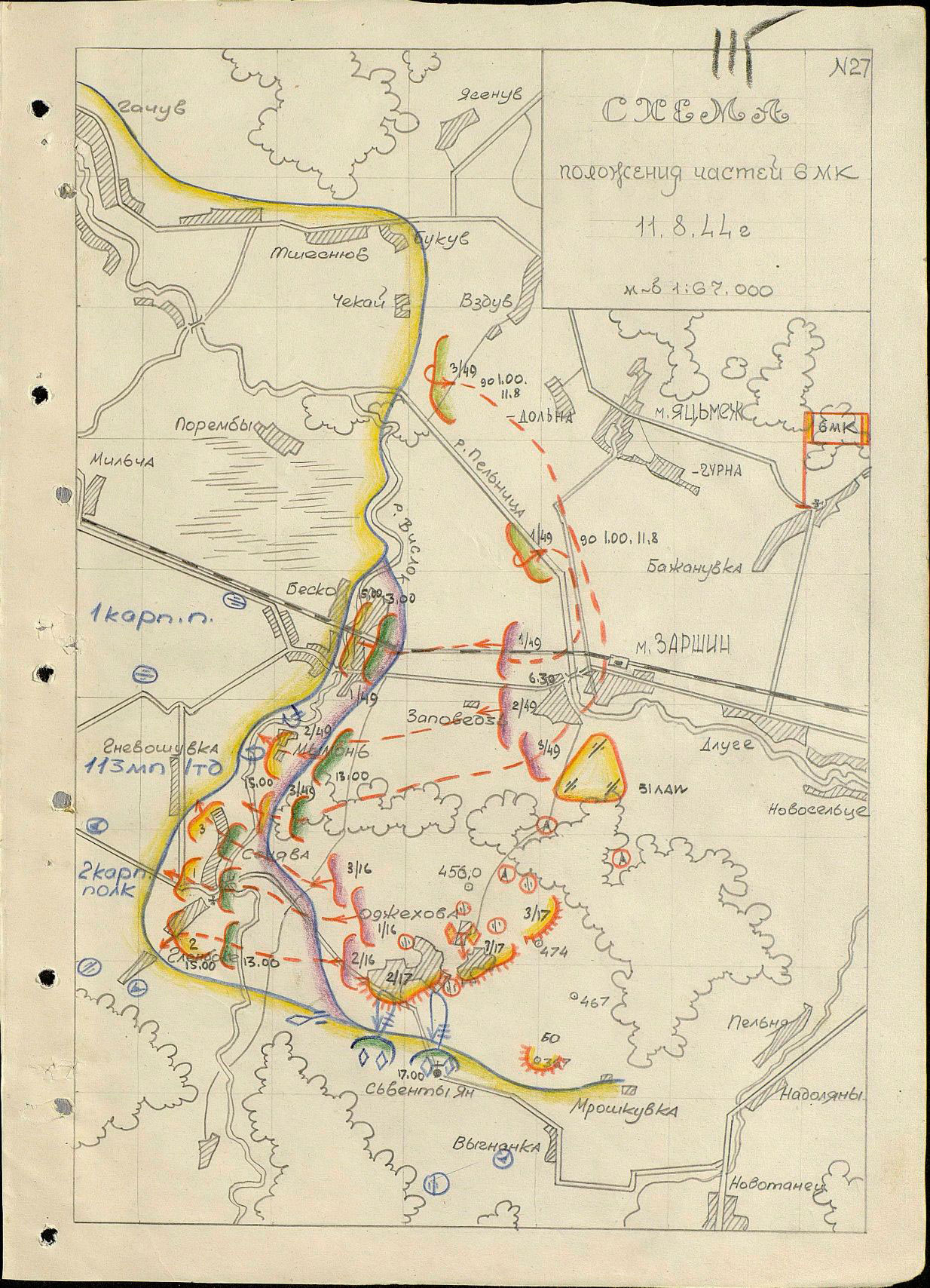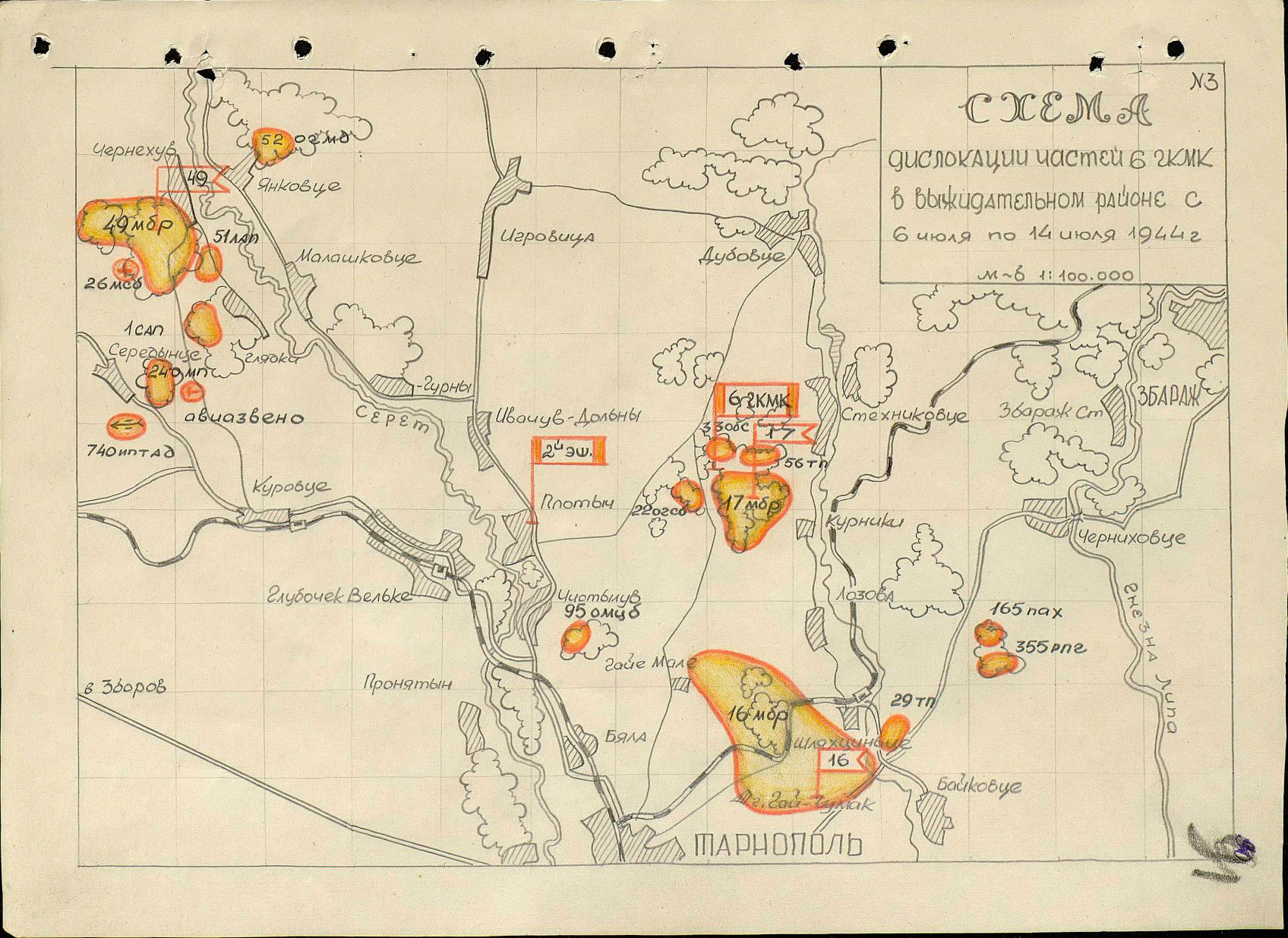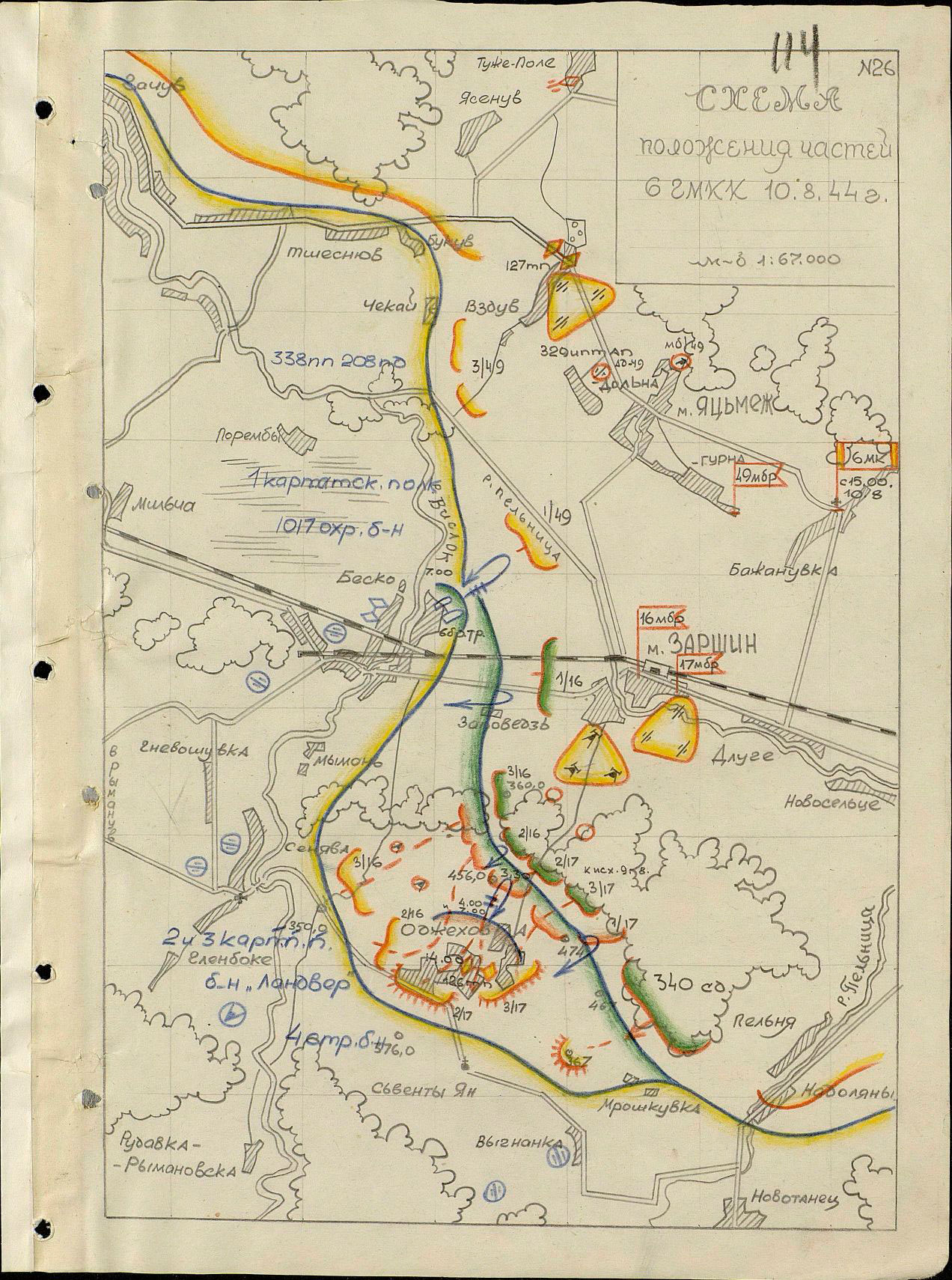 Танковые полки мехбригад к утру 9.7 прибыли в район сосредоточения бригад в полном составе. 29 тп к 24.00 8.7 сосредоточился на южн.окр. ШЛЯХЦИНЬЦЕ; 56 тп на сев. опушке леса ур. ГОНЧАРЫХА к 5.00 9.7.44 г. 51 лап после ночного марша к 2.00 9.7 на сев.-зап. опушке леса, что юго-зап. ЧЕРНЕХУВ. 740 оиптад с утра 8.7 мелкими группами совершил марш и к 14.00 8.7 занял ОП на юго-зап. окр. ВОРОБИЮВКА.8 52 огмд мелкими группами в течение дня совершил марш и к 20.00 8.7 полностью сосредоточился в лесу ур. СРЕДНИ ГАЙ (сев.-вост. ЯНКОВЦЫ).