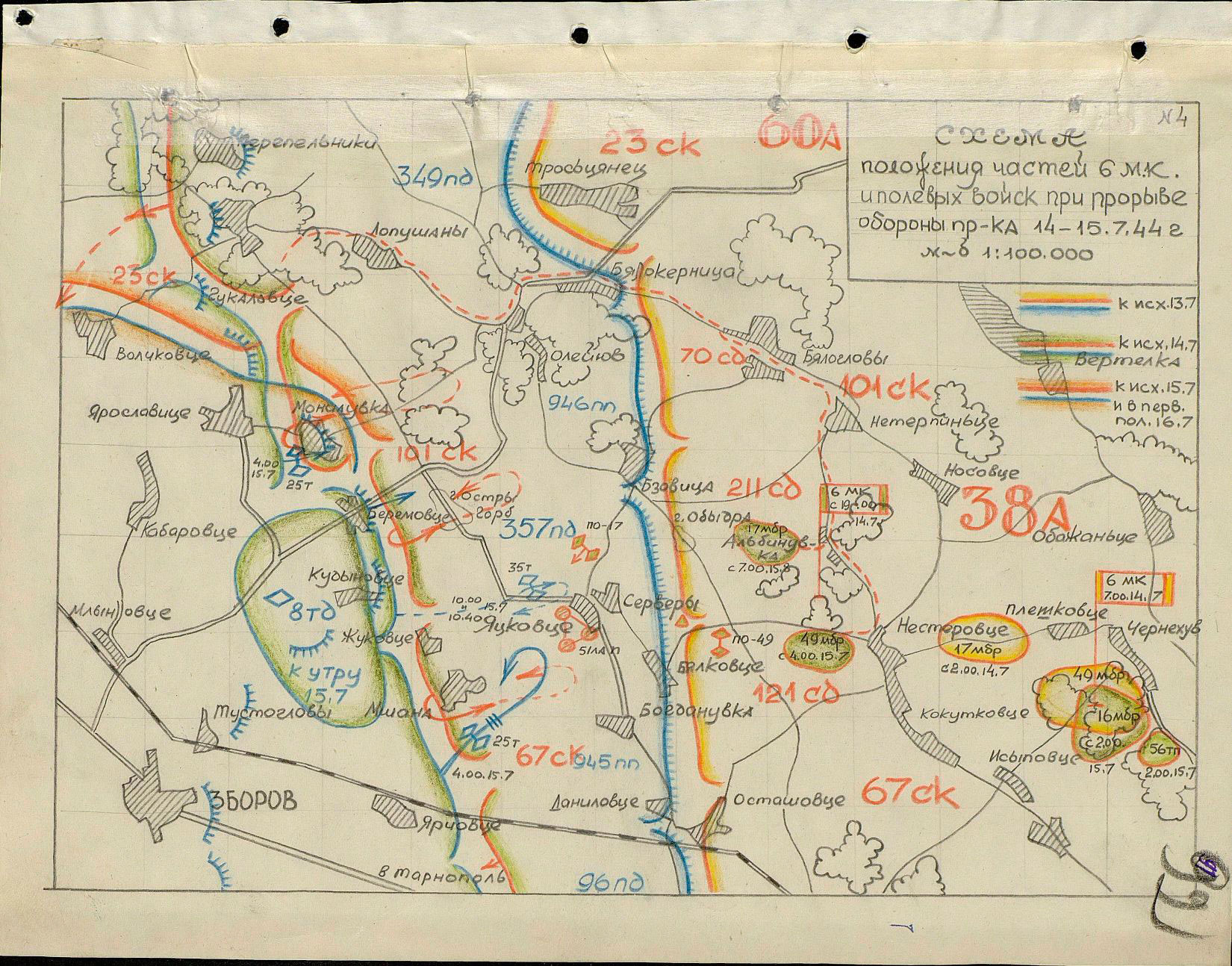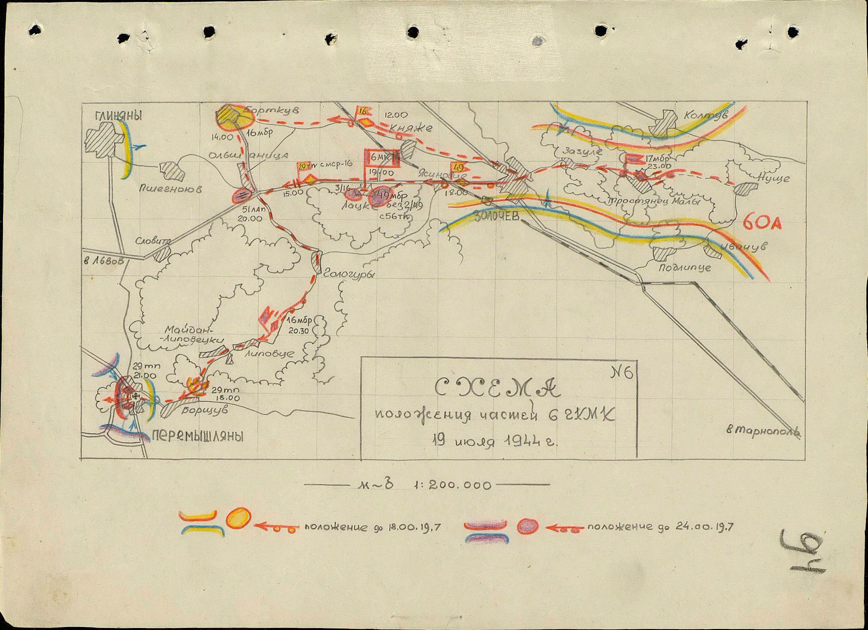 Согласно устному приказу командующего 4 ТА от 1.7.44 г., отданному командиру корпуса, было известно, что корпус вводится в прорыв на участке 211 сд 101 ск в общем направлении БЕРЕМОВЦЕ, МЛЫНОВЦЕ (3 км сев. ЗБОРОВ), м. ПОМОРЖАНЫ, м. ДУНАЮВ, БЖУХОВИЦЕ, ОСТАЛОВИЦЕ, КОЛОГУРЫ, ГУЦИСКА, ГРУДЕК ЯГЕЛЬОНСКИЙ с задачей к исходу 1-го дня ввода в прорыв выйти в район ЗАРУДКА (3 км сев. м. ПОМОРЖАНЫ), БУБШАНЫ, РОЗГАДУВ, ГОДУВ, ЖАБИН. ПО10 — м. ДУНАЮВ. К исходу 2-го дня главными силами выйти в район НЕДЗЕЛИСКА, (иск.) ТЫЧНА, ДОБЖАНИЦА, БЖУХОВИЦЕ, МЕРЫШУВ. ПО — на рубеже ХОДЕРКОВИЦЕ, КОЛОГУРЫ. К исходу 3-го дня главными силами выйти в район КРАСУВ, ПОЛЯНА, (иск.) СУХОДУЛ, (иск.) ЛОПУШНА, одной бригадой — ДРОГОВЫЖЕ, РАЗВАДУВ, НИКОЛАЕВ. ПО — МОСТЫ, КОЛОДРУБЫ. К исходу 4-го дня — ДРОЗДОВИЦЕ, ГРУДЕК ЯГЕЛЬОНСКИЙ, ЛЮБЕНЬ-ВЕЛЬКЕ, КЕРНИЦА. ПО — КОНЮШКИ СЕМЕНОВСКИЕ.