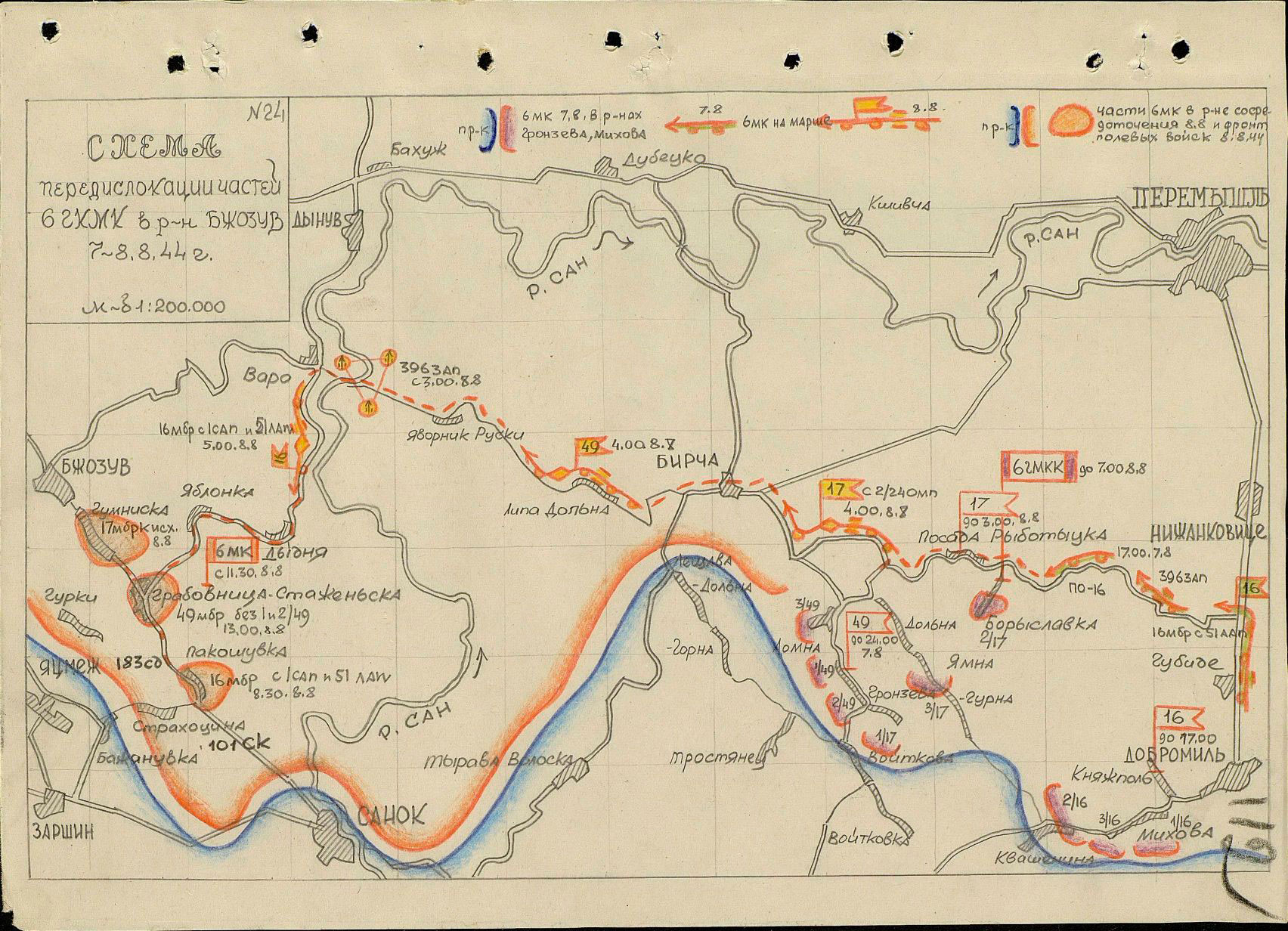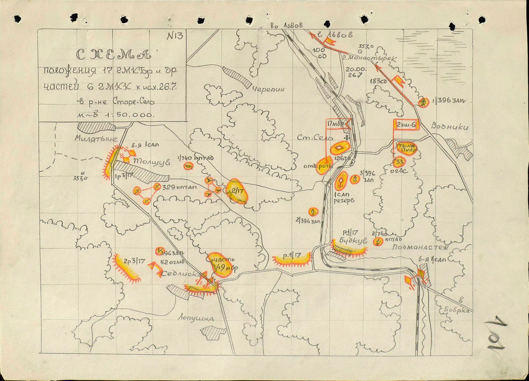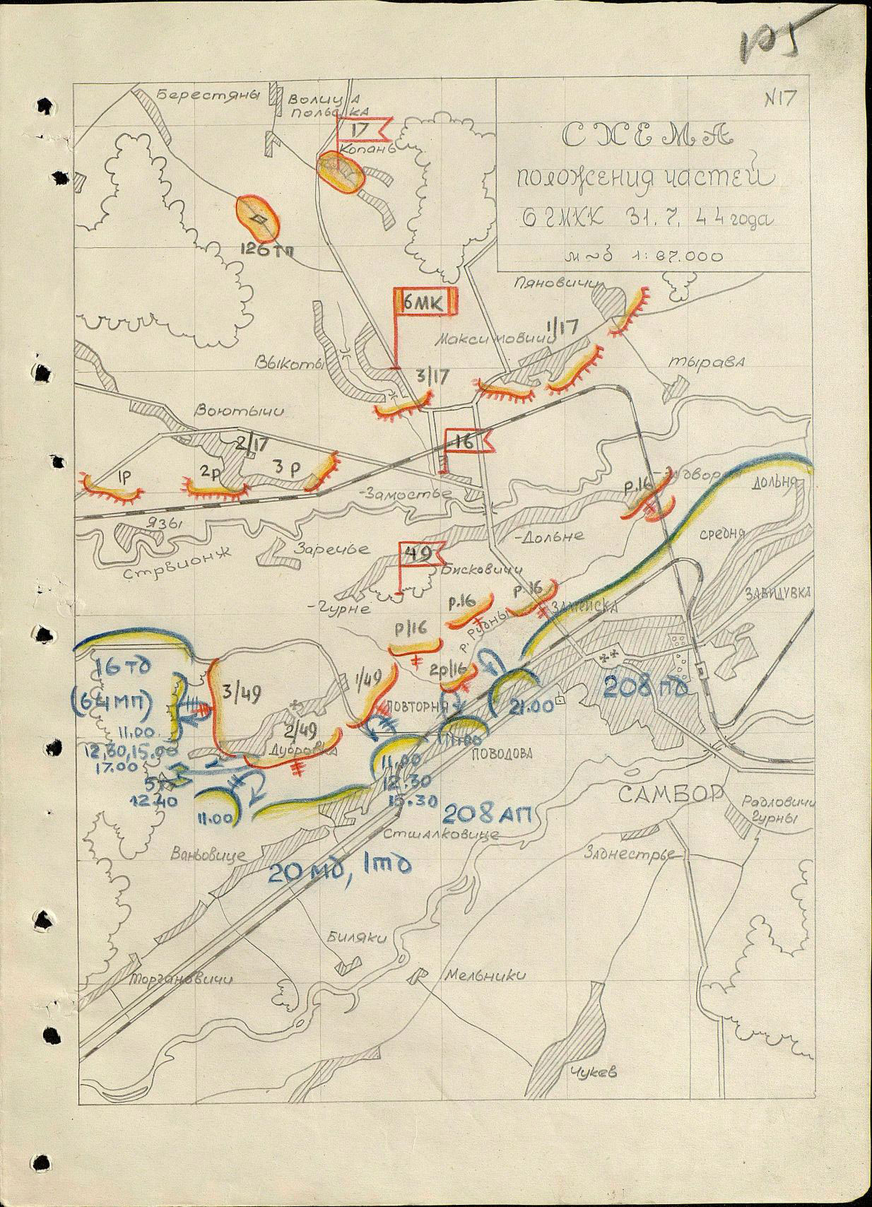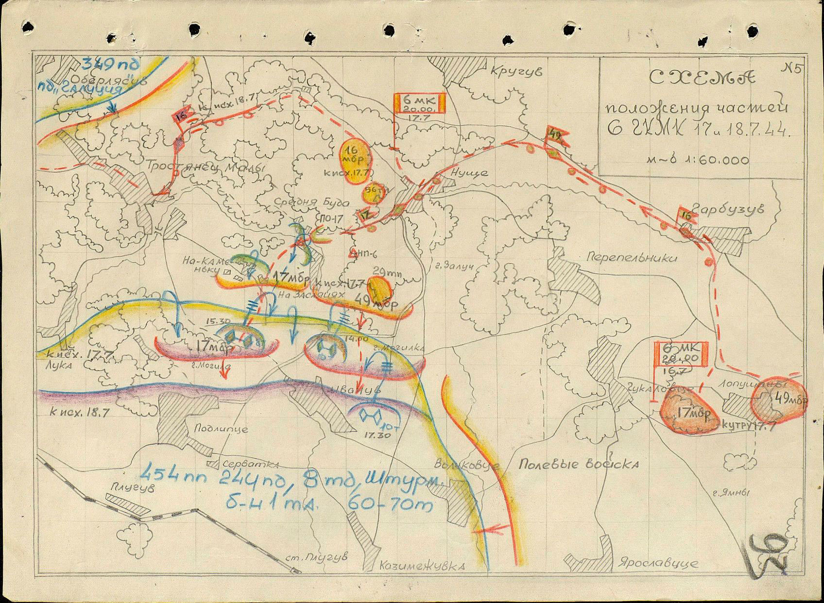 2-й мсб 49 мбр прошел исходный пункт в 17.30, 3-й мсб в 18.00, артдив и минбат в 18.30. 2-й и 3-й [мсб 16 мбр] прошли исходный пункт в 19.00, 2-й и 3-й мсб и спецподразделения 17 мбр прошли головой [колонны] исходный пункт в 18.00. На исходном пункте (перекресток дорог в СУХОСТАВ) прохождение частей регулировалось специально выделенными офицерами штакора. К рассвету 6.7.44 г. 2-й и 3-й мсб 16 мбр сосредоточились на дневку в районе ИВАНУВКА, 2-й и 3-й мсб 17 мбр в районе Глещава, 2-й и 3-й мсб 49 мбр в лесу 2 км сев. ЗАГУЖЕ.