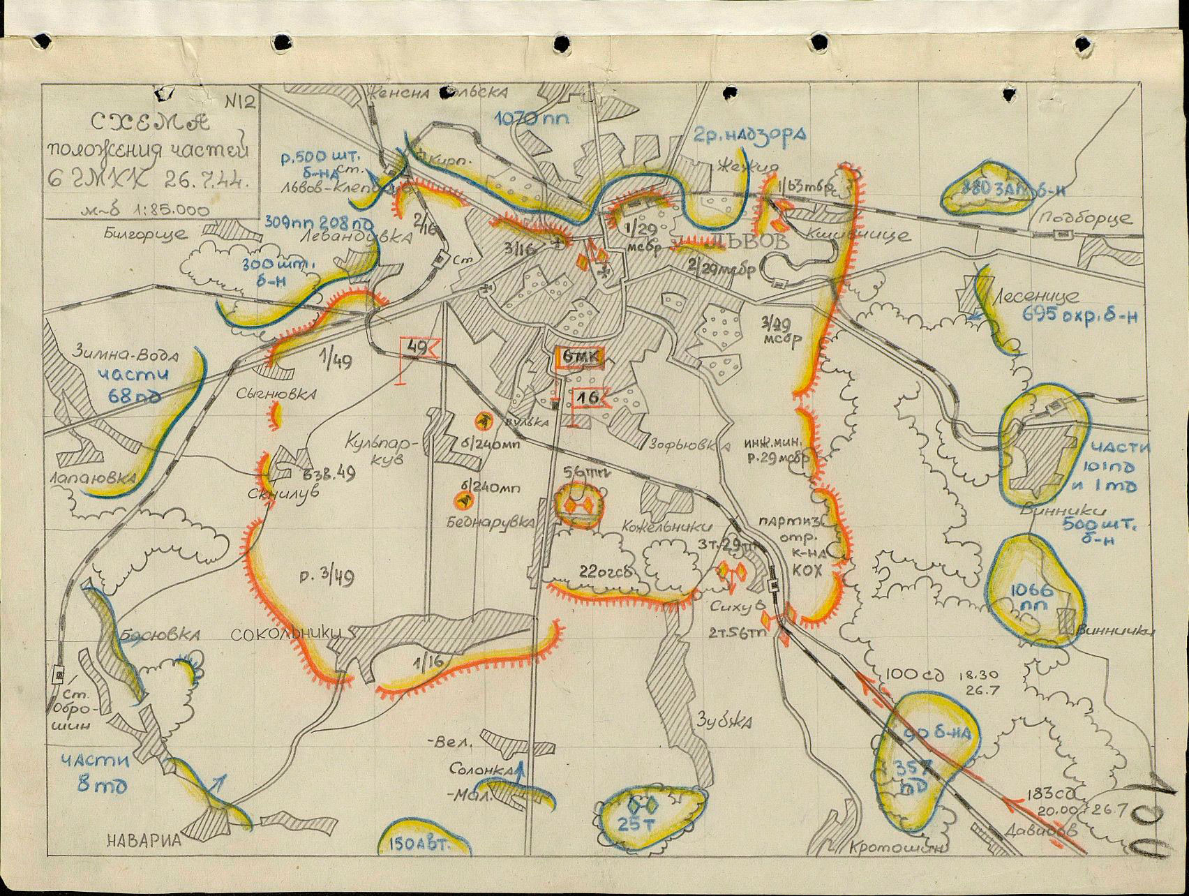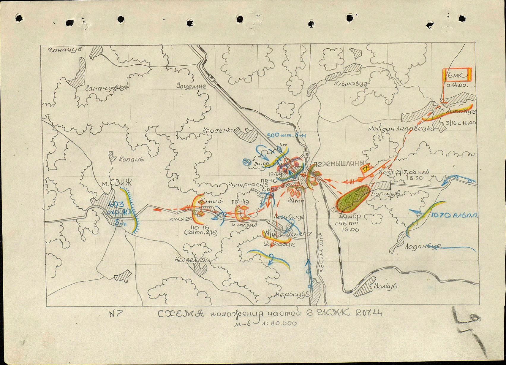 Резервы противника находятся в районе м. ПОДГОРЦЕ (3456), САСОВ — 8 тд; ТРОСЬЦЯНЕЦ МАЛЫ (2035), ЗБОРОВ, КУДЫНОВЦЕ, МАНИЛУВКА — до двух пп, ШЕПАНУВ (7262), ТЕЛЯЧЕ (7062) — 20 мд; БЕРЕЖАНЫ (8050) — до пп и 40 танков (см. карту № 1).12