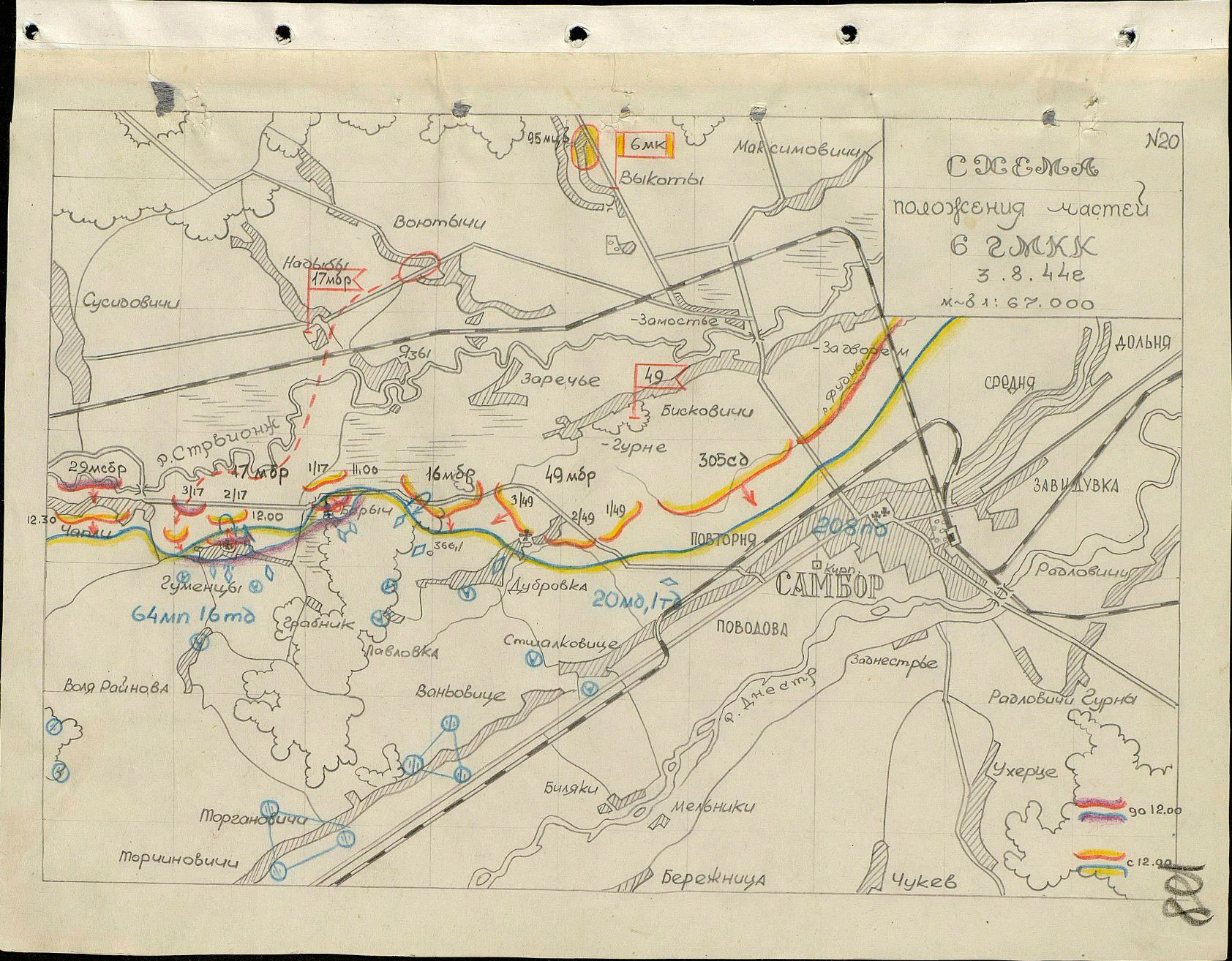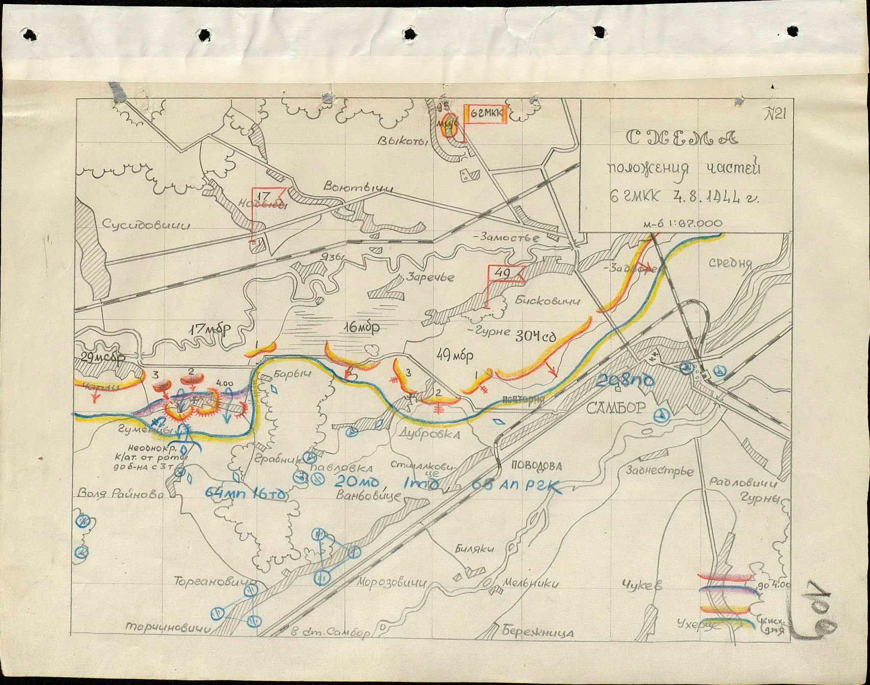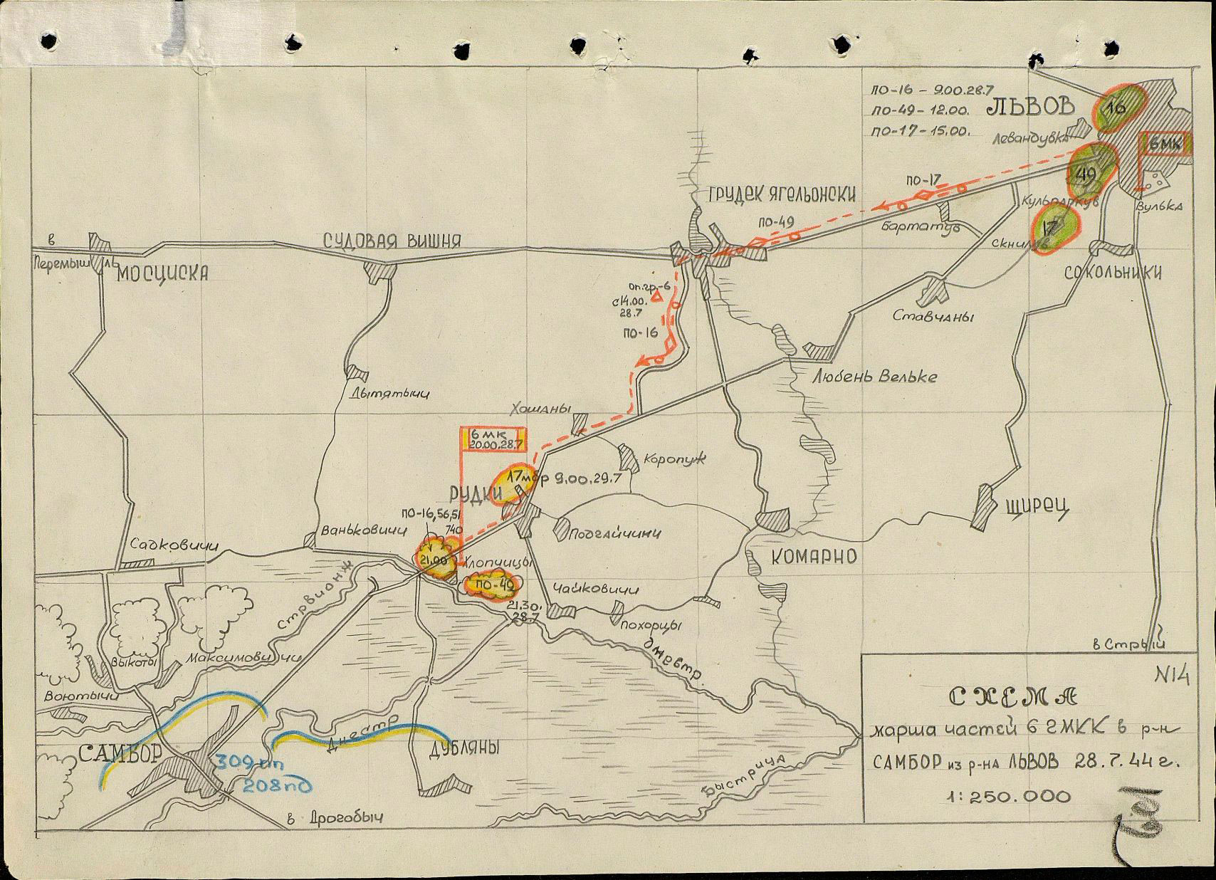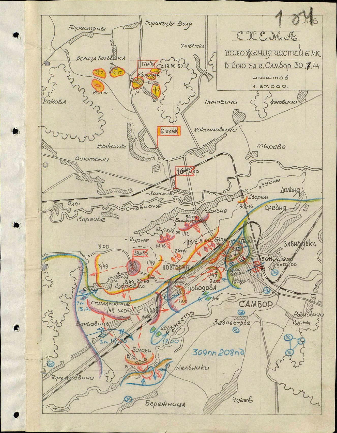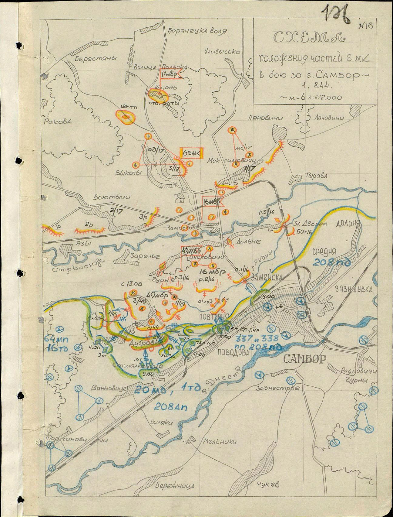 В дальнейшем иметь в виду нанести удар главными силами корпуса в направлении ГУТА ШЕЖЕЦКА, ШЕЖЕЦ, ГРУДЕК ЯГЕЛЬОНСКИЙ, одновременно обеспечивая одной усиленной мбр левый фланг армии от ударов противника с направления ДРОГОБЫЧ, СТРЫЙ, захватив переправу через р. ДНЕСТР на рубеже КОНЮШКИ СЕМЕНОВСКИЕ, МОСТЫ, НИКОЛАЮВ.