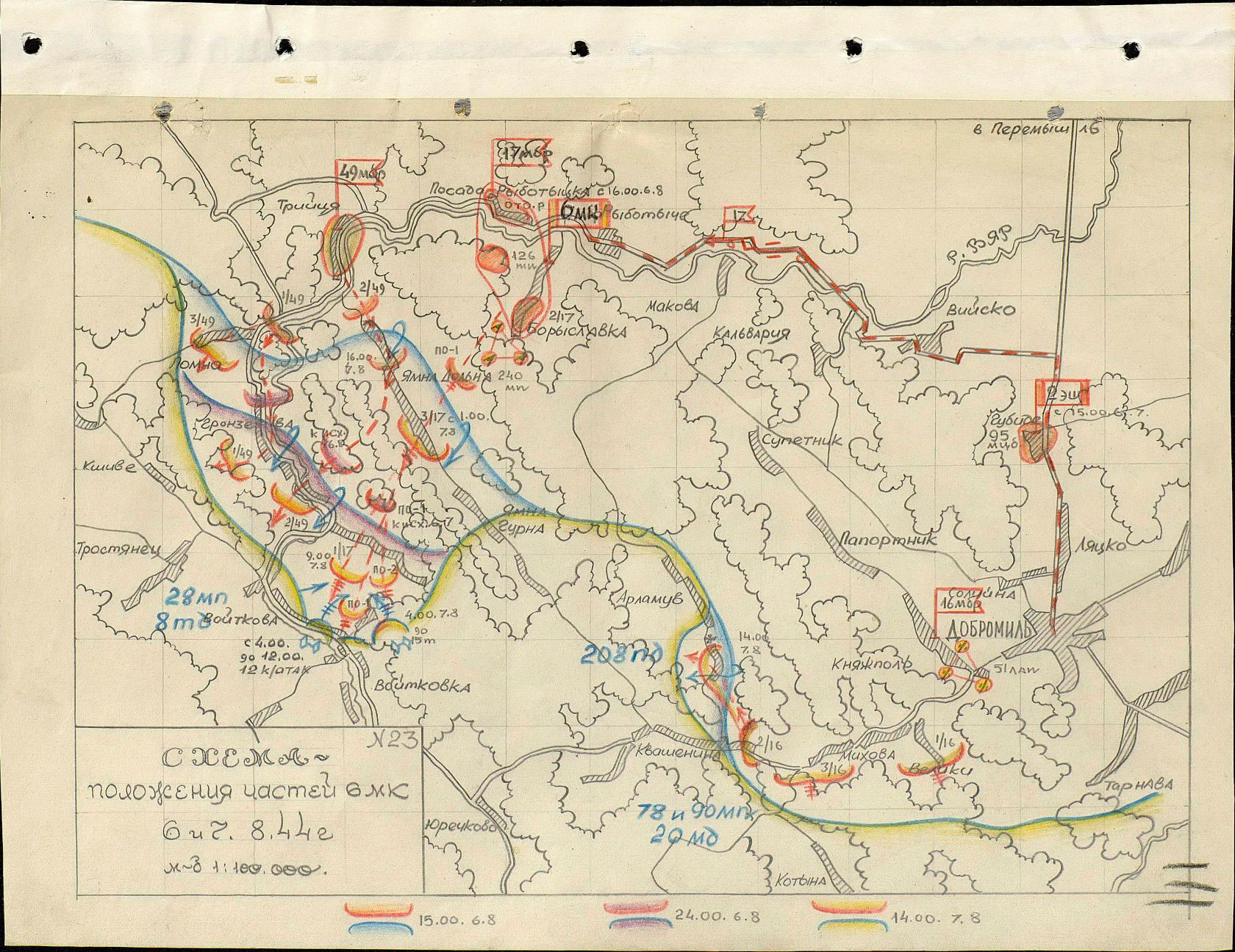 121 и 211 сд прорывают оборону противника на участке выс. 394,0, (иск.) БОГДАНУВКА, нанося главный удар в направлении ЗБОРОВ, м. ПОМОРЖАНЫ, к исходу 1-го дня операции выходят на рубеж ПЛЕСНЯНЫ, УРЛЮВ, ТРАВОТЛОКИ, выс. 388,0.