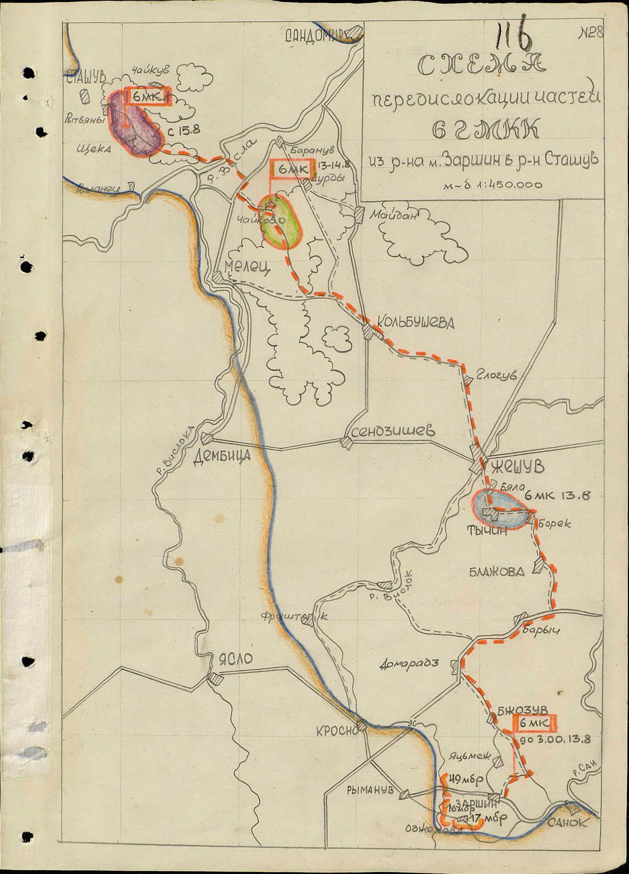 б) 16 мбр3 в пешем строю следовать по маршруту № 2, исходный пункт СУХОСТАВ пройти головой колонны в 21.00 5.7.44 г. и к 3.00 6.7.44 г. сосредоточиться в районе ВИКТОРУВКА, ИВАНУВКА, в 19.00 6.7.44 г. выступить из данного района с задачей к 3.00 7.7.44 г. сосредоточиться на дневку в районе южн. БАВОРУВ. В дальнейшем в 20.30 7.7.44 г. головой колонны пройти выс. 341,0, следовать за 49 мбр и к 4.00 8.7.44 г. сосредоточиться в районе выс. 351,0, выс. 379,0, ГАЙЕ-МАЛЫ, ШЛЯХЦИНЬЦЕ. Автотранспорт мотострелкового батальона вести по маршруту № 4, исходный пункт СУХОСТАВ пройти головой колонны в 21.00 5.7.44 г. и к 3.00 6.7.44 г. сосредоточиться в районе сосредоточения бригады. Тылы бригады и артчасти вести по маршруту № 4, исходный пункт СУХОСТАВ пройти в 22.40 6.7 и к 4.00 7.7.44 г. сосредоточиться в районе сосредоточения бригады.