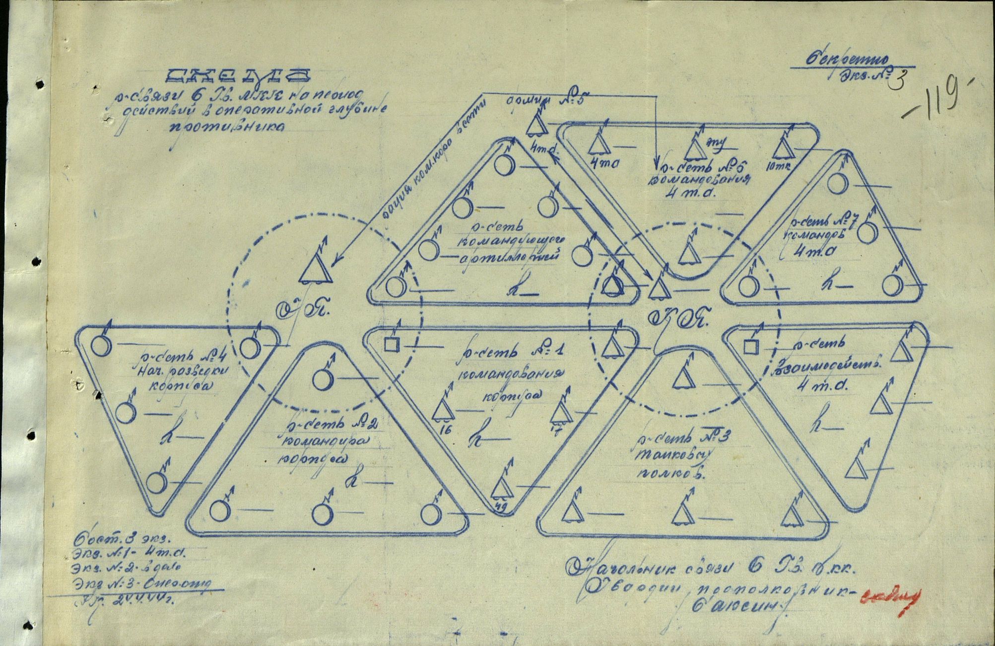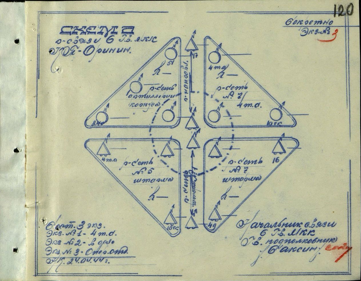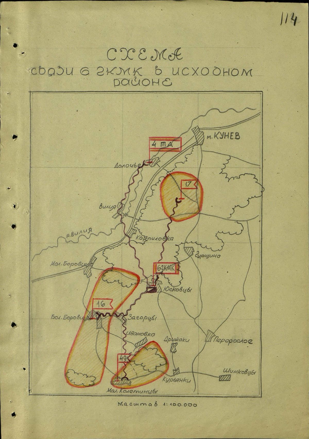 В районе исходного положения штакор-6 имел проводную связь с частями корпуса, 23 СК, 351 сд и 10 ТК (см. схему).