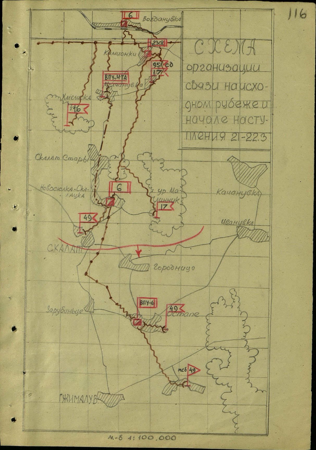 С этого момента ВПУ штакора с рубежа СКАЛА имел проводную связь с частями. Строились две осевые линии с использованием постоянных линий связи: одна за 49 и 16 мбр на ОРИНИН, КАМЕНЕЦ-ПОДОЛЬСК, другая за 17 мбр, наступавшей на МЕЛЬНИЦА.