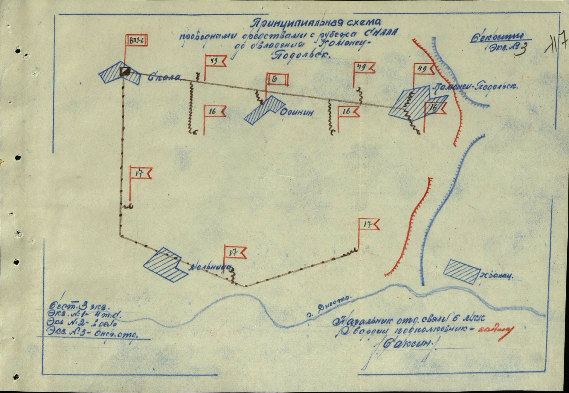 В дальнейшем наступать в направлении м. ОРИНИН и к исходу 3-го дня операции овладеть г. КАМЕНЕЦ-ПОДОЛЬСК, удерживая его до подхода полевых войск. Справа входил в прорыв 10 ТК, левый фланг открыт.